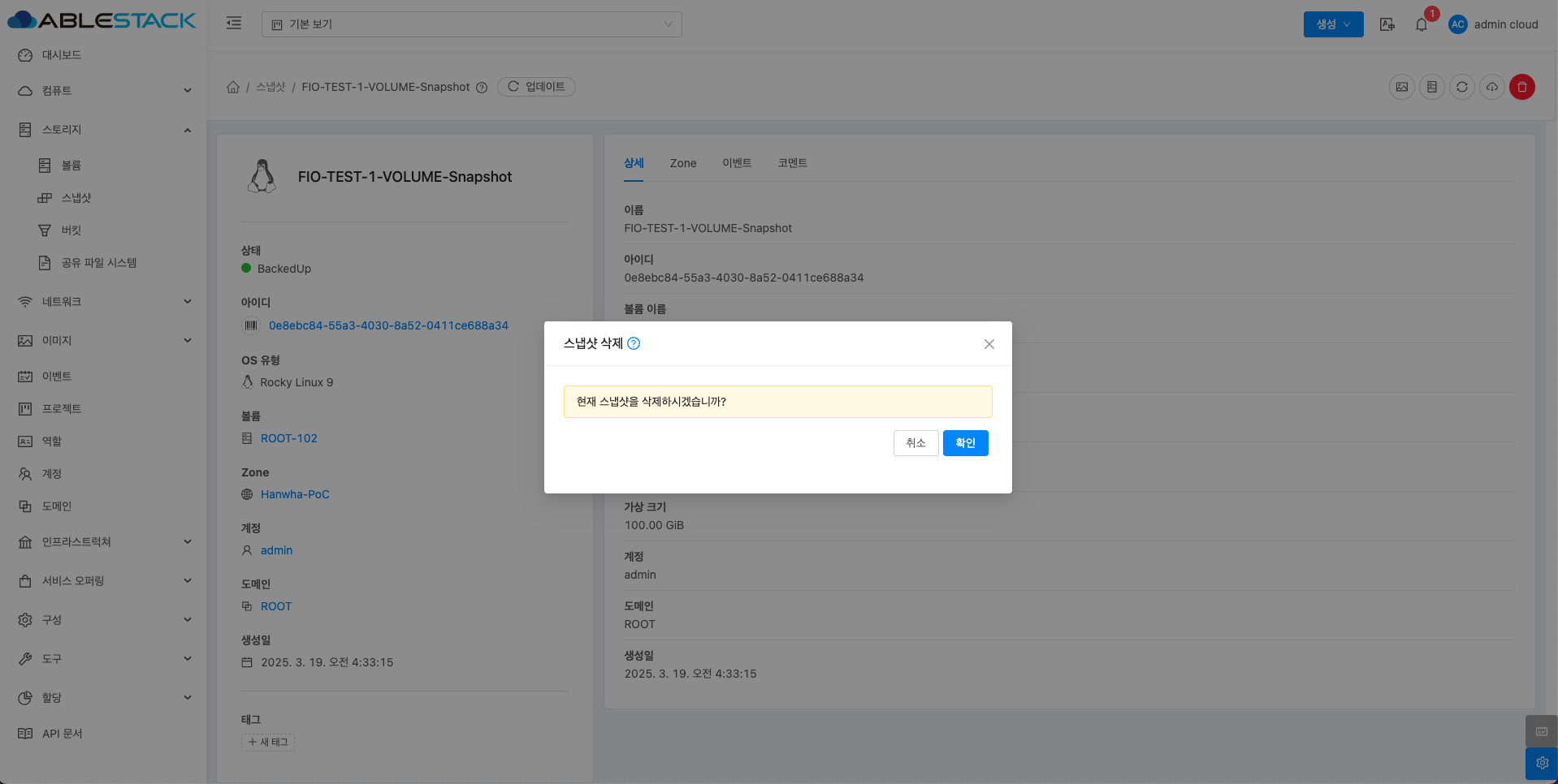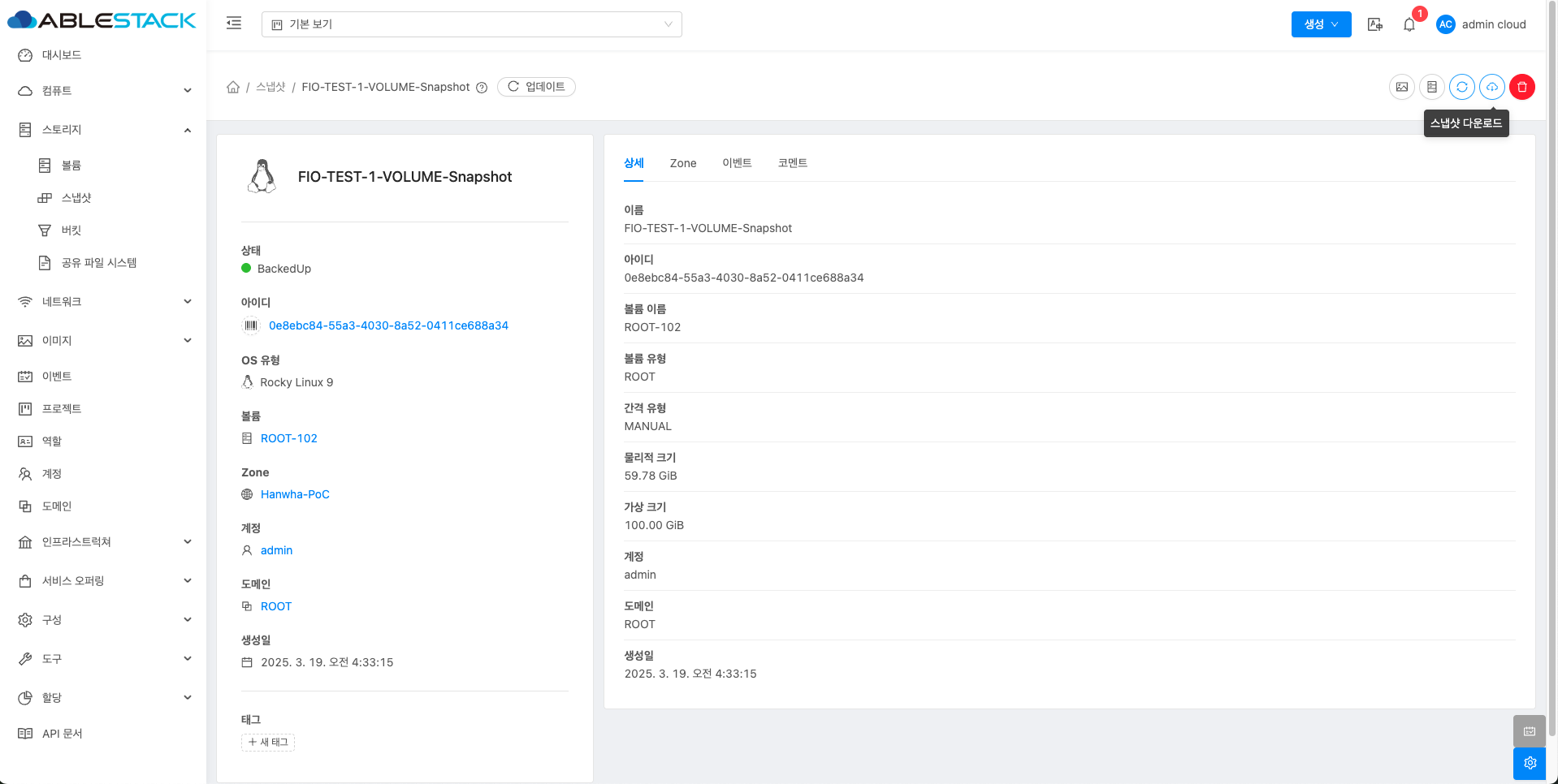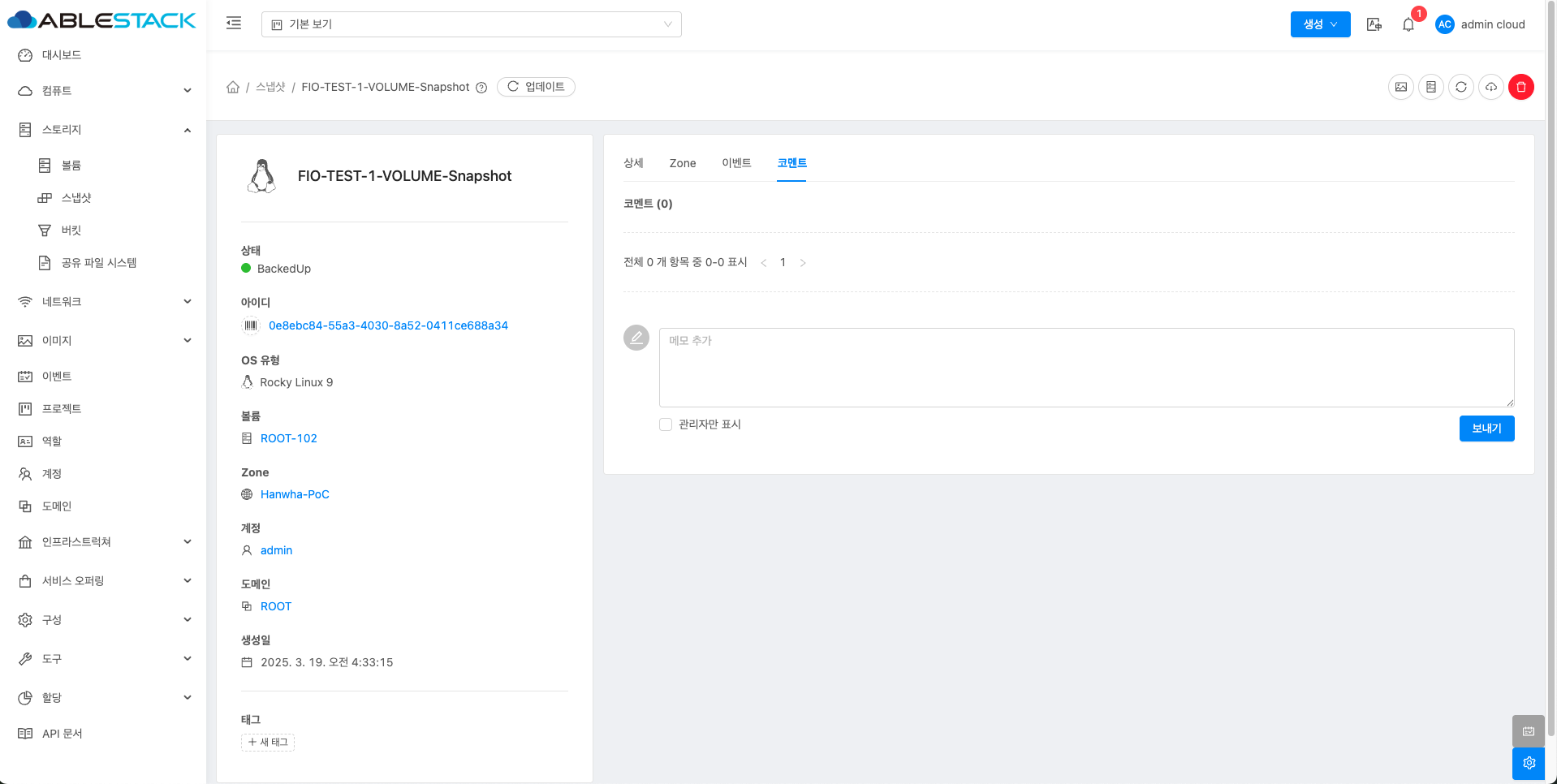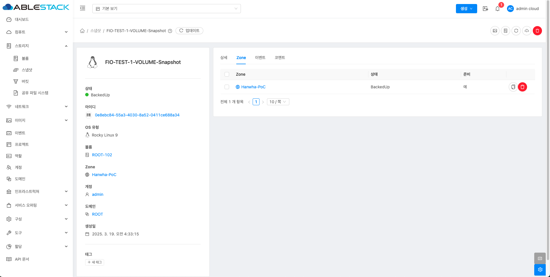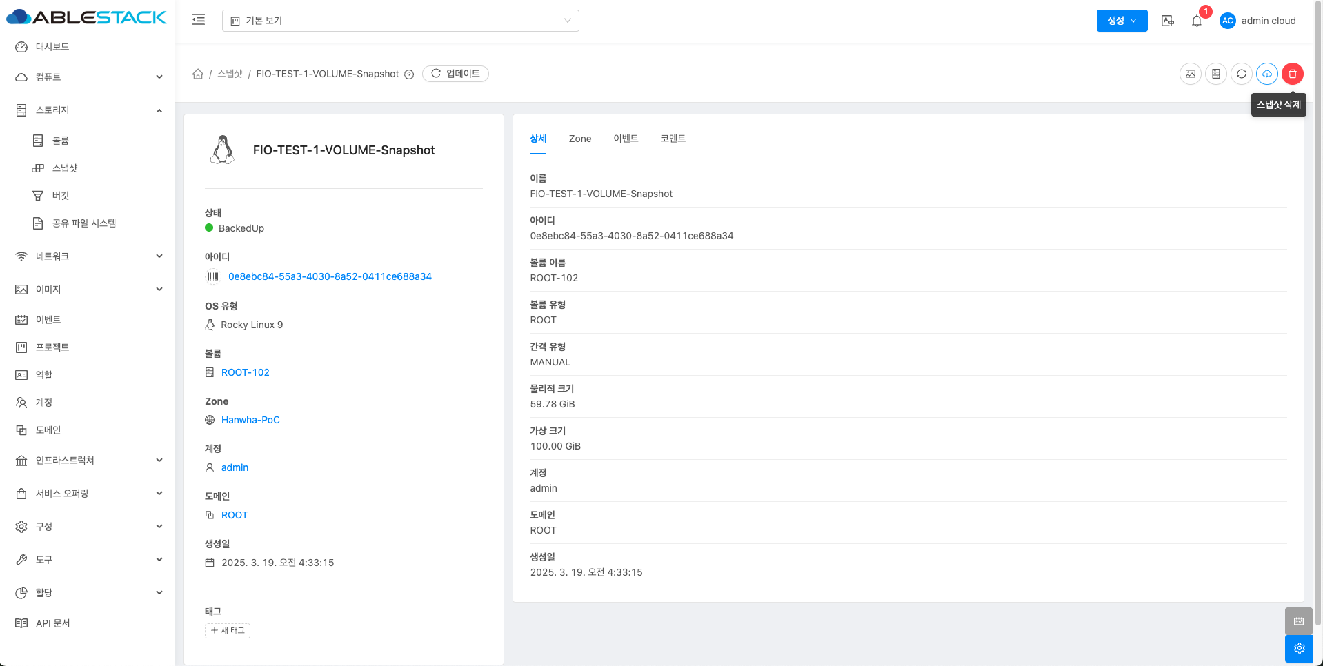 - 생성된 볼륨 스냅샷은 스토리지의 스냅샷 목록에서 확인하실 수 있습니다.