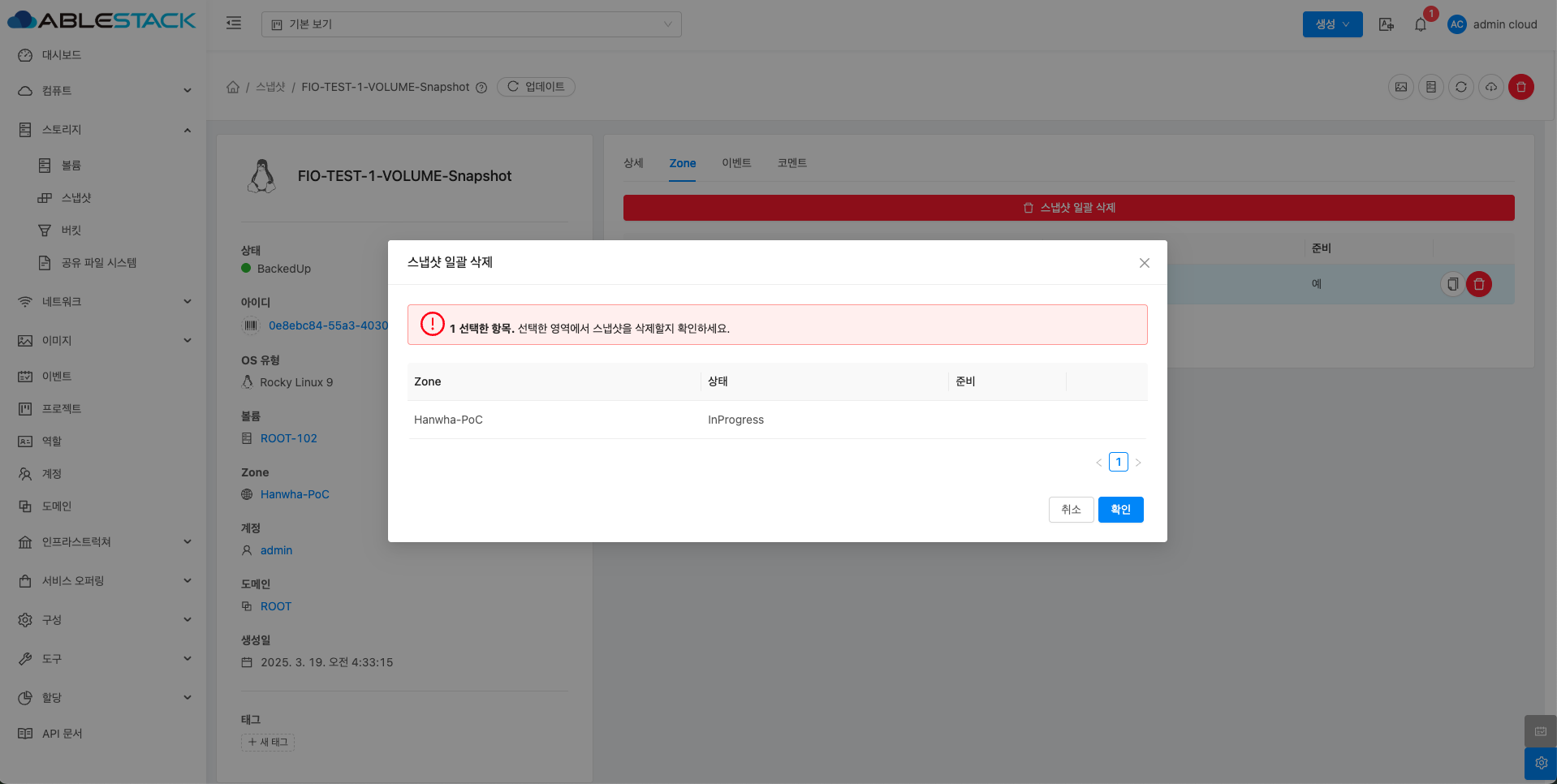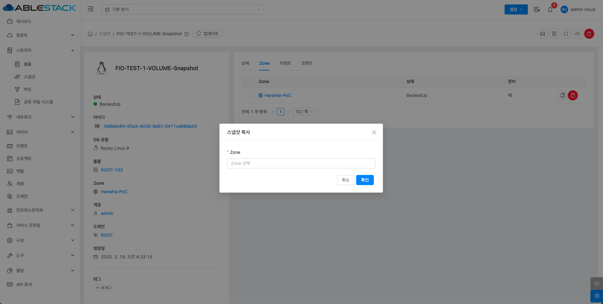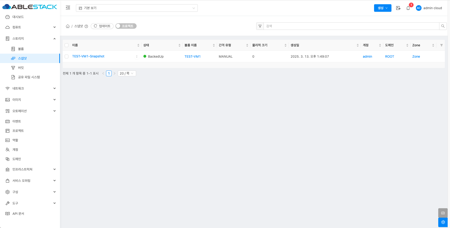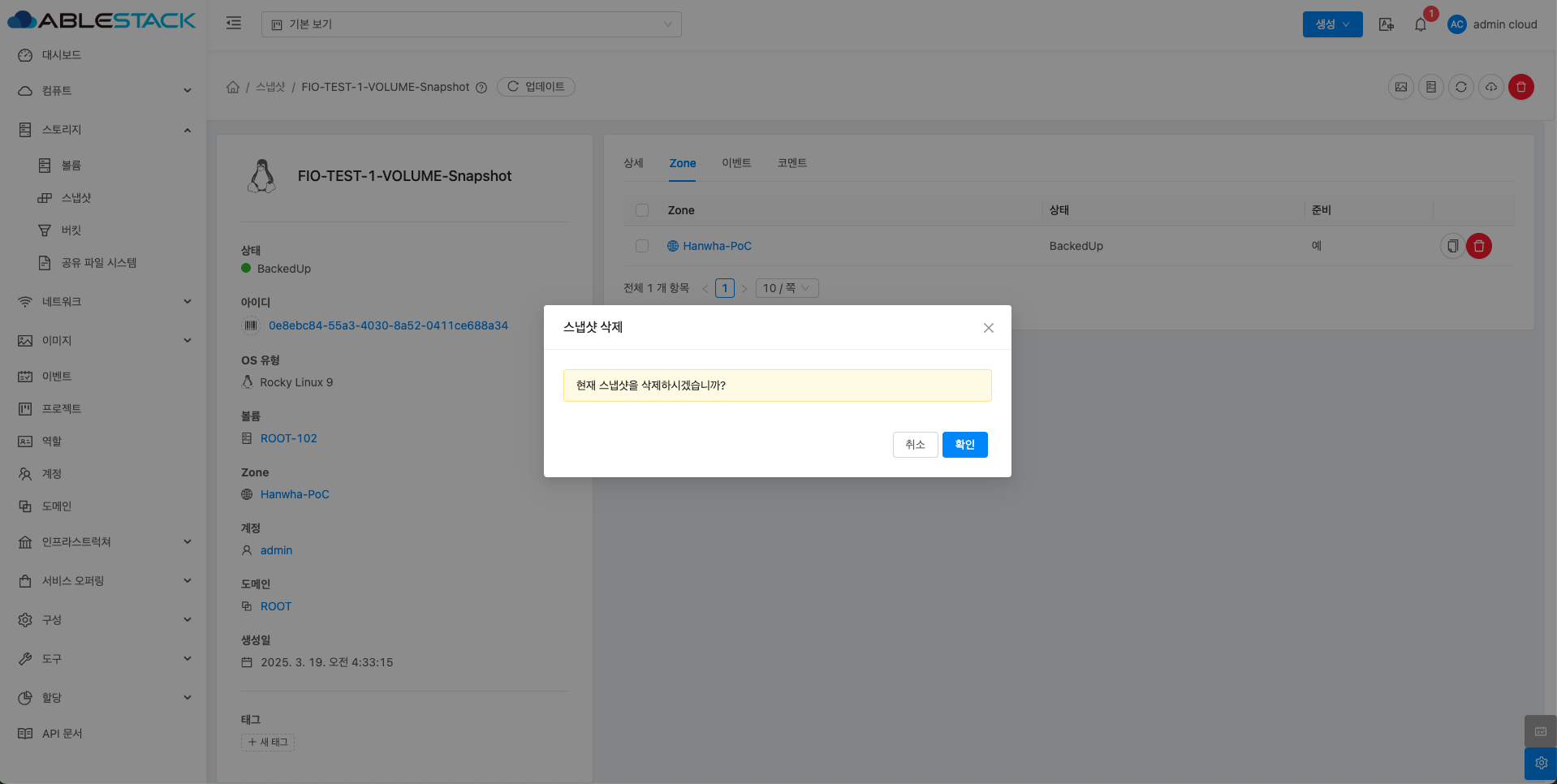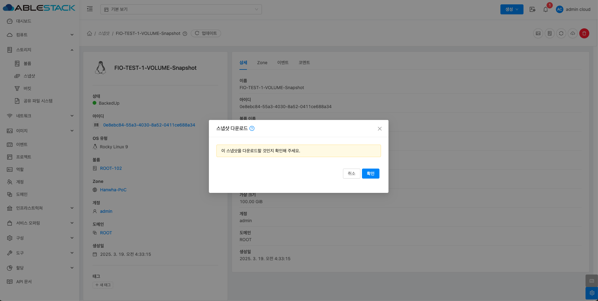 - 생성된 볼륨 스냅샷은 스토리지의 스냅샷 목록에서 확인하실 수 있습니다.
