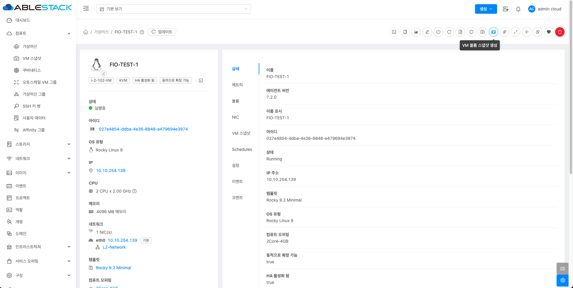 - 스냅샷 생성은 해당 가상머신의 상세 페이지에서 VM 볼륨 스냅샷 생성 버튼을 클릭합니다.