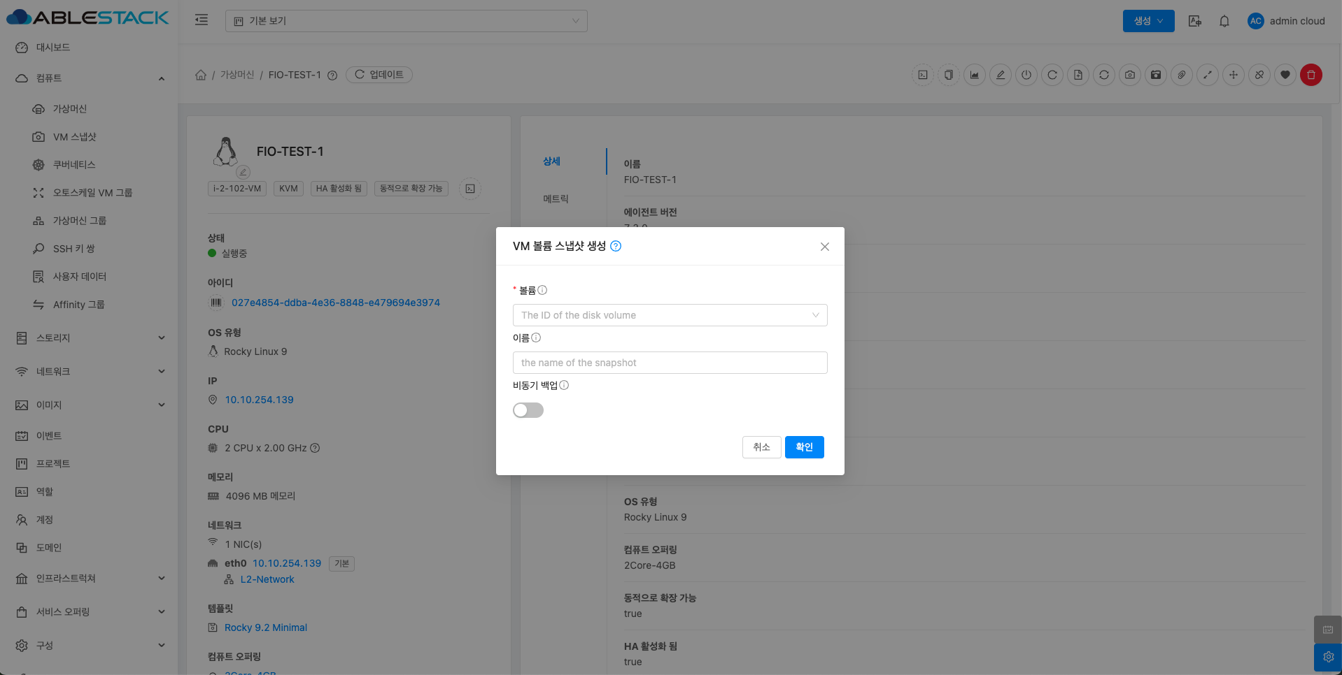 - VM 볼륨 스냅샷 생성 버튼을 클릭한 화면입니다.