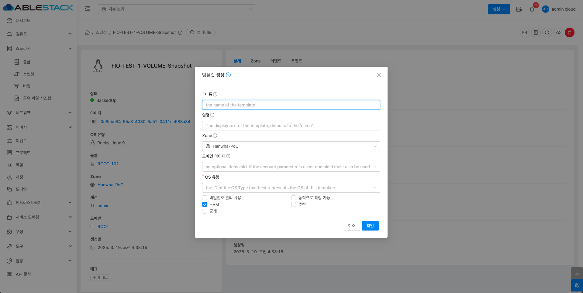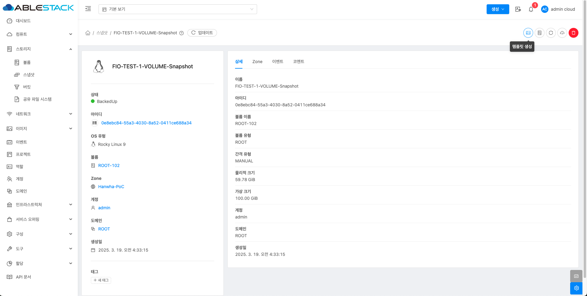 - 스냅샷 상세 오른쪽 상단의 템플릿 생성 버튼을 클릭합니다.