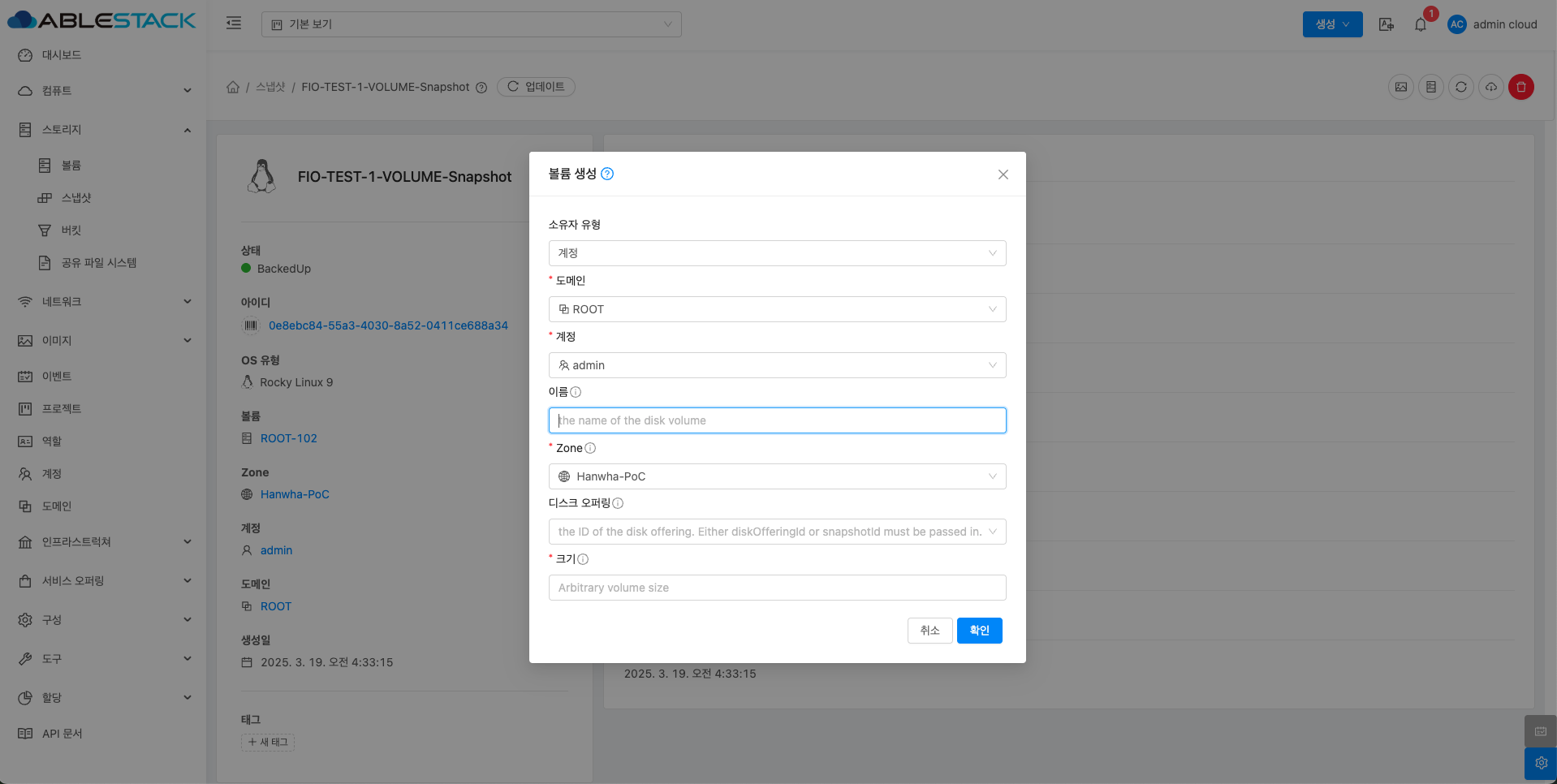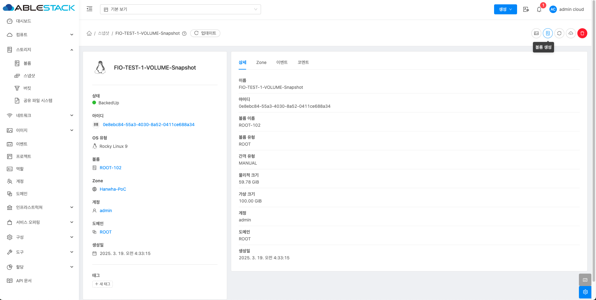 - 스냅샷 상세 오른쪽 상단의 볼륨 생성 버튼을 클릭합니다.