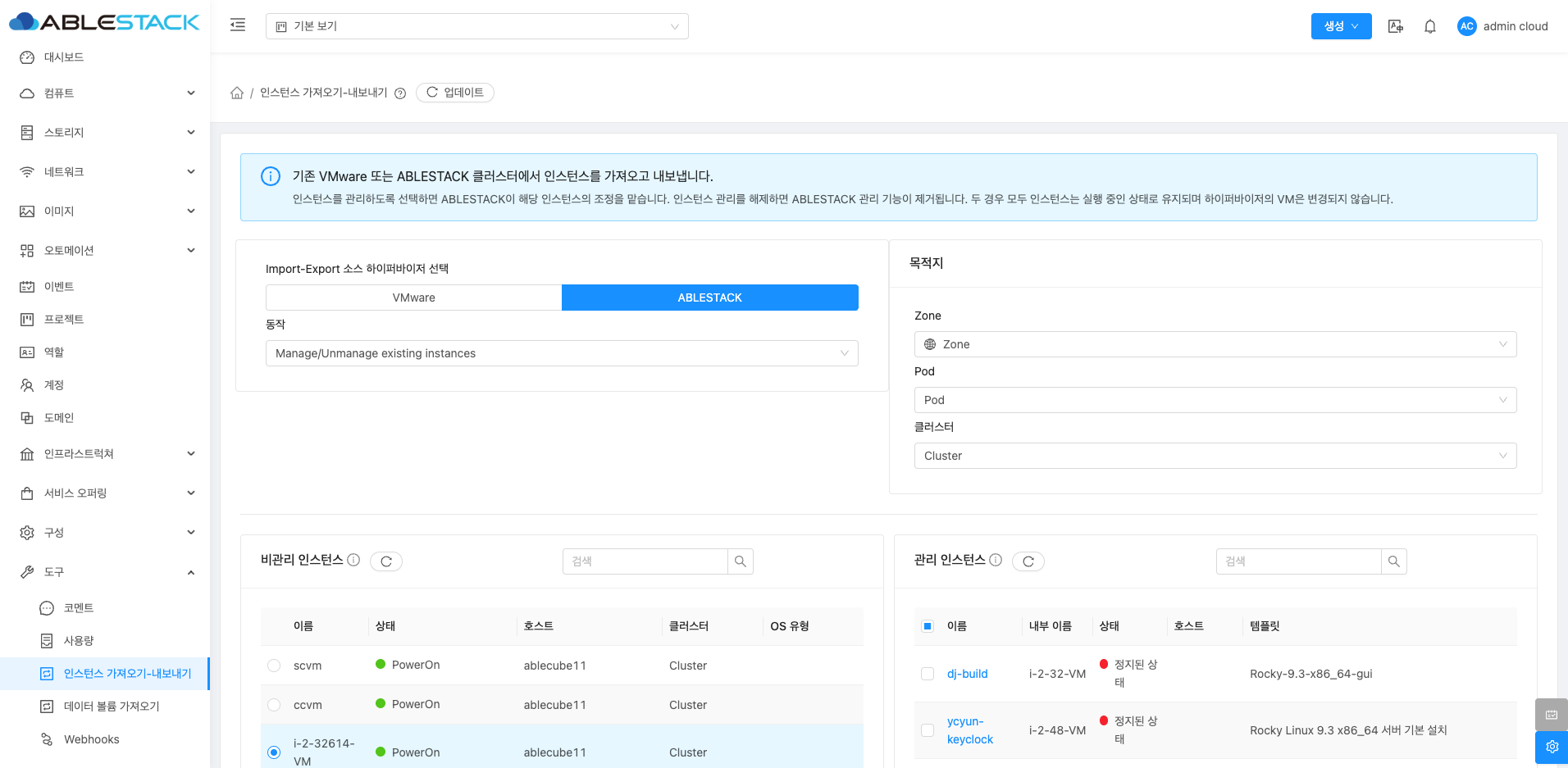 - 관리 인스턴스: 현재 VMware 또는 ABLESTACK에서 관리 중인 인스턴스 목록을 보여줍니다.