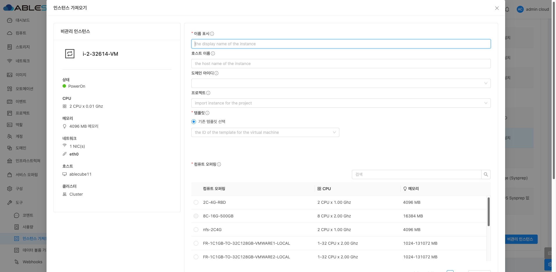 - Manage/Unmanage existing instances: VMware에서 이미 관리 중인 인스턴스를 ABLESTACK 관리로 가져오거나 해제합니다.