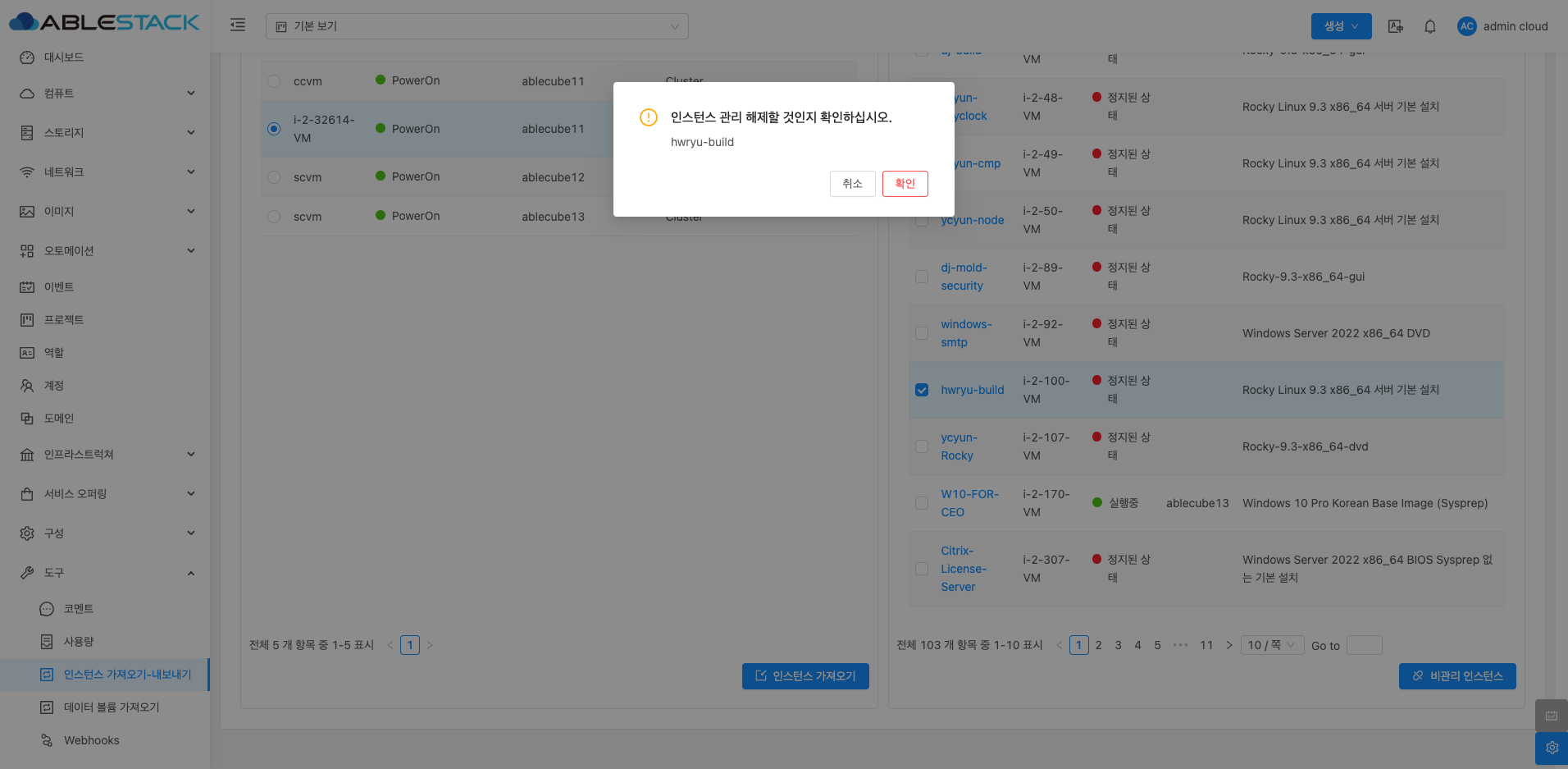 관리 인스턴스의 우측 하단에 있는 비관리 인스턴스 버튼을 클릭하면 ABLESTACK 클라우드에서 관리 중인 해당 인스턴스를 다시 외부 관리 상태로 되돌리는 작업을 수행합니다.