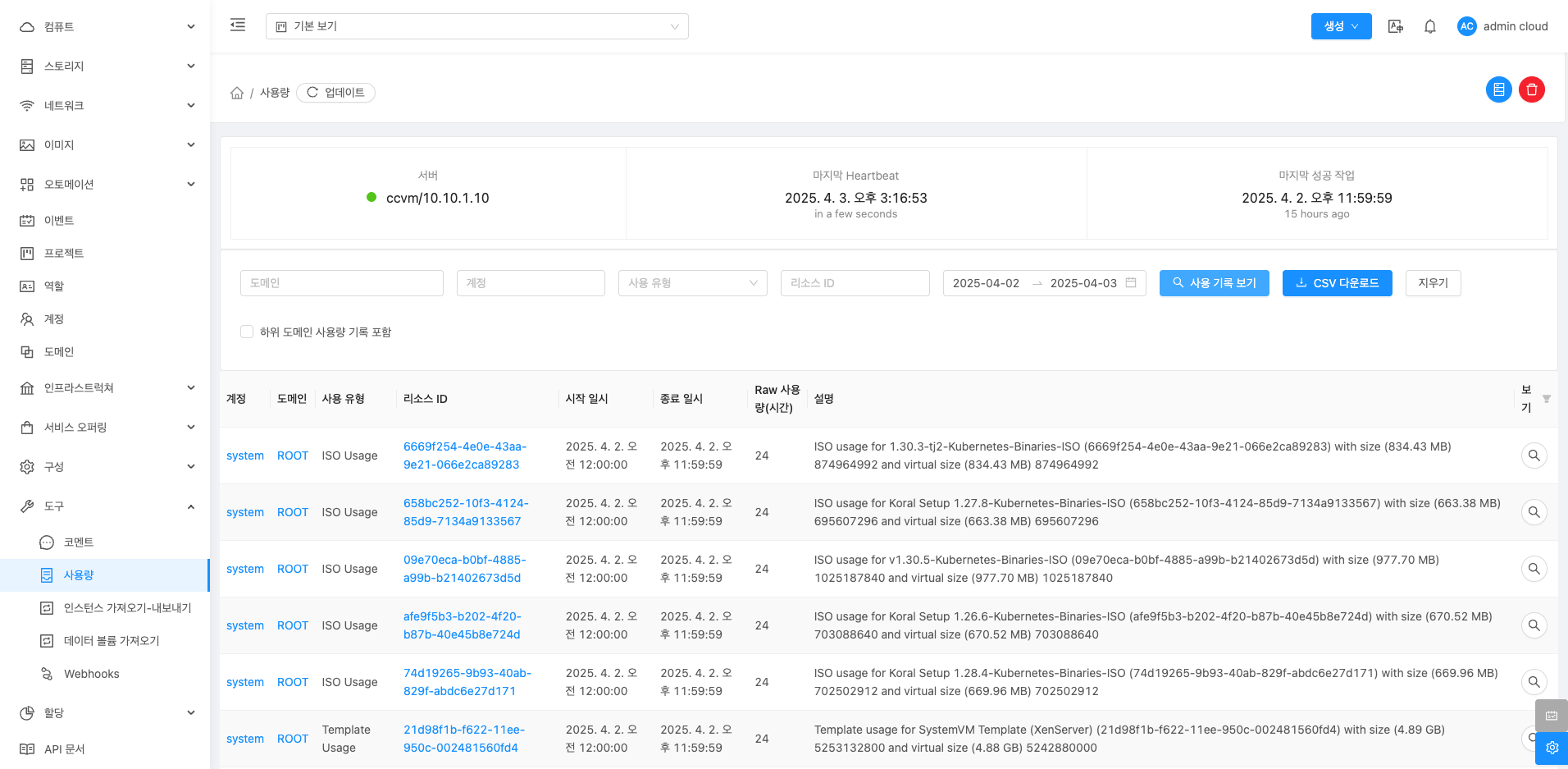 - CSV 다운로드: 조회한 사용량을 CSV 파일로 다운로드할 수 있습니다.