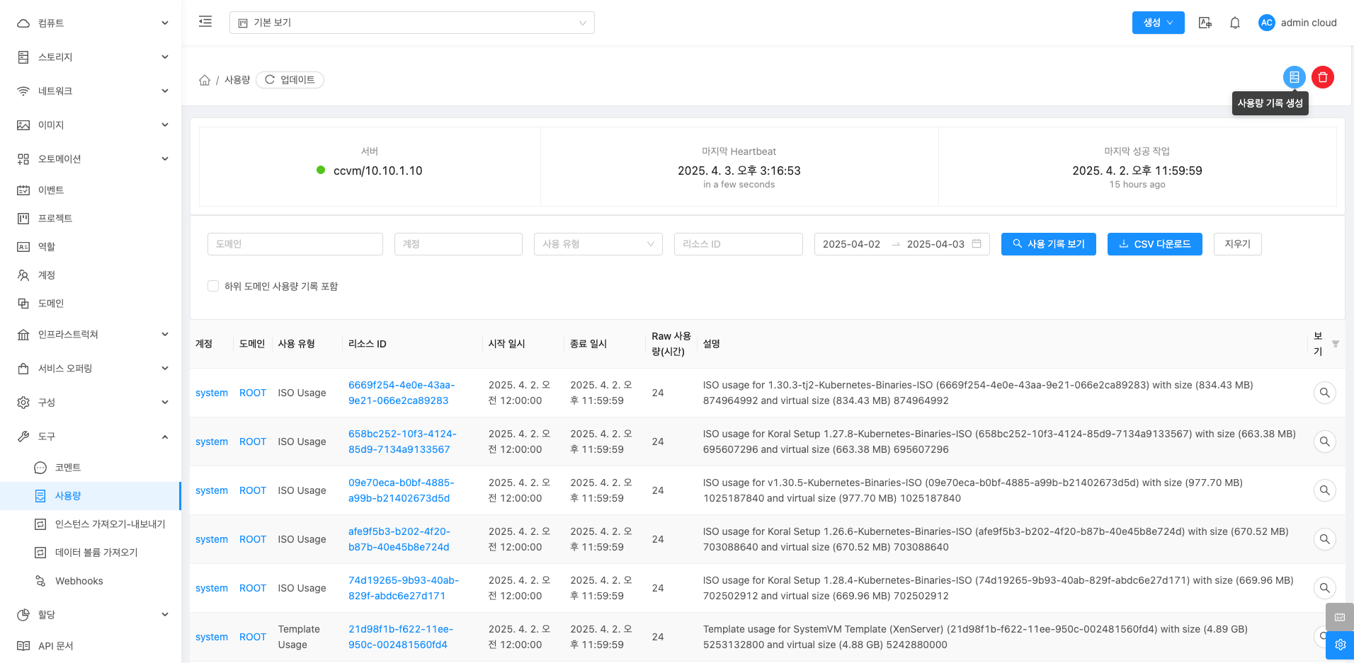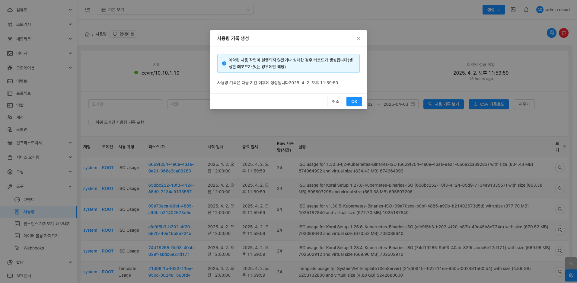 사용량 메뉴 화면 오른쪽 상단의 사용량 기록 생성 버튼을 클릭하여 특정 시간 범위 내 클라우드 자원의 사용량 데이터를 수집하여 기록을 생성합니다. 이 기능은 예약된 사용 작업이 실행되지 않았거나 실패한 경우에 수동으로 사용량 기록을 생성할 때 유용합니다.