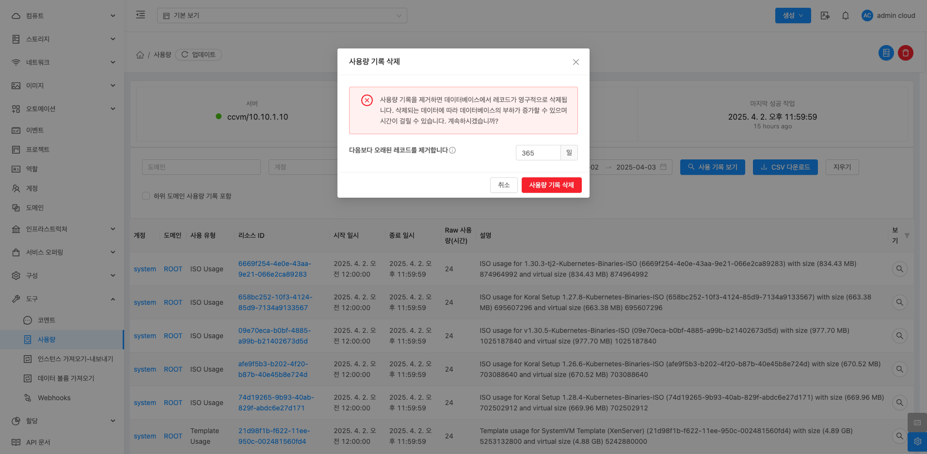 사용량 메뉴 화면 오른쪽 상단의 사용량 기록 삭제 버튼을 클릭합니다. 이 기능은 데이터베이스에 저장된 사용량 기록을 영구적으로 제거하여 데이터베이스의 부하를 줄이기 위해 사용됩니다.