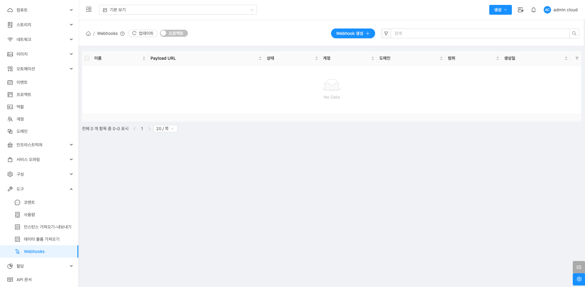 Webhook 메뉴 화면 구성¶