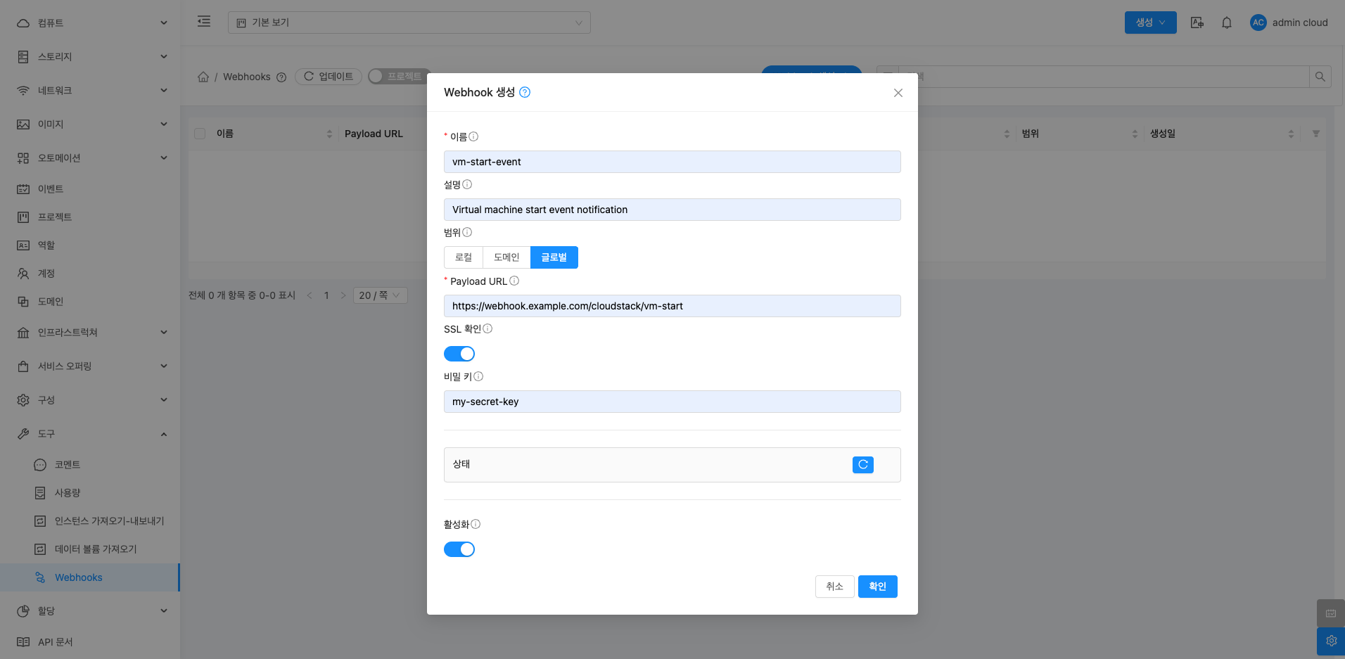 - 활성화: Webhook의 활성화 여부를 설정합니다.