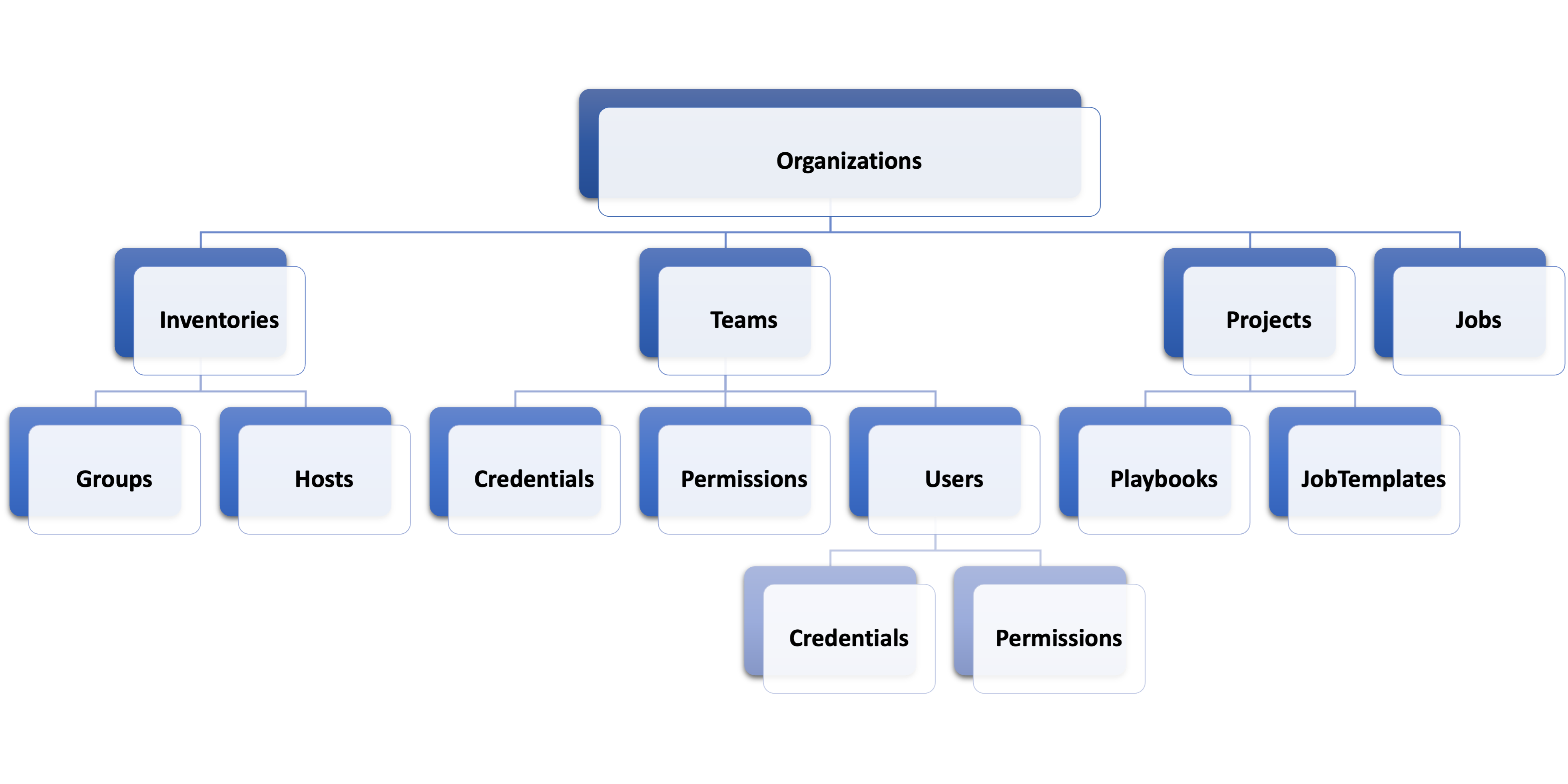 조직은 Users, Teams, Projects 및 Inventories 의 논리적 모음이며 자동화 컨트롤러 개체 계층에서 가장 높은 수준입니다.
