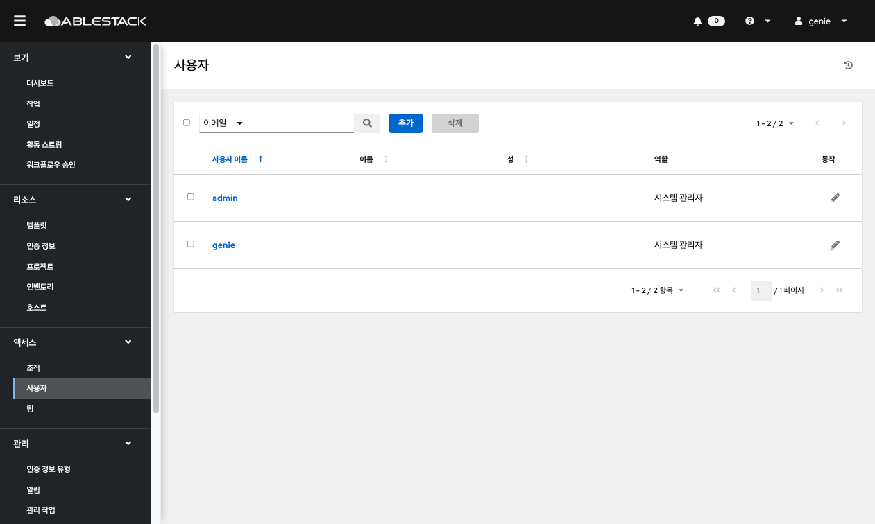 생성된 사용자 리스트가 표시되며 편집 및 삭제할 수 있습니다.