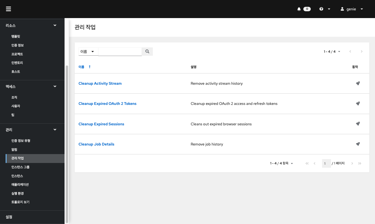 관리 작업은 시스템 추적 정보, 토큰, 작업 기록 및 활동 스트림을 포함하여 컨트롤러에서 오래된 데이터를 정리하는 데 도움이 됩니다. 특정 보존 정책이 있거나 컨트롤러 데이터베이스에서 사용하는 스토리지를 줄여야 하는 경우 사용할 수 있습니다.