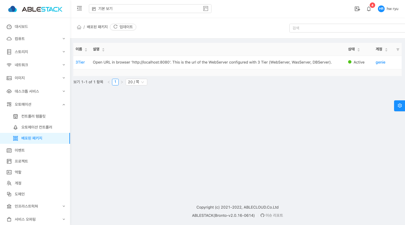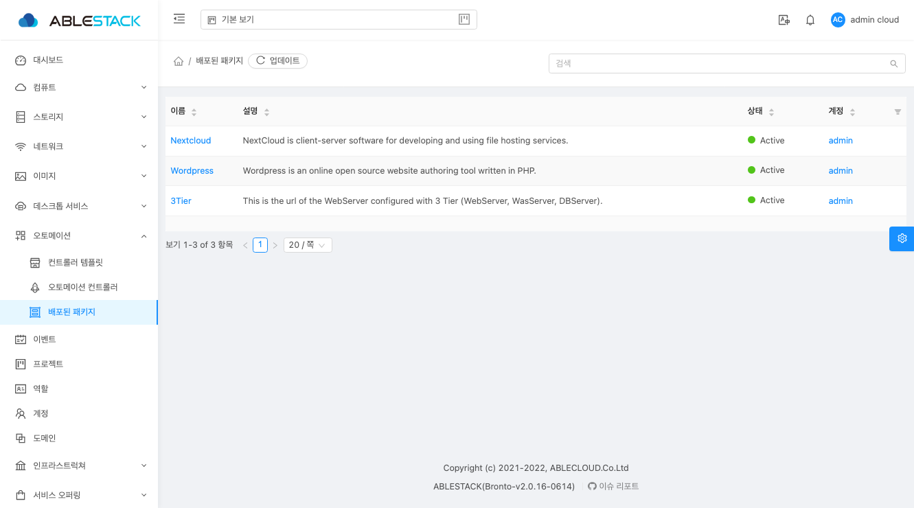 ABLESTACK Genie에서 기본 제공되는 템플릿은 애플리케이션 배포를 기준으로 배포, 체크, 삭제 3가지의 템플릿이 하나의 세트 로 구성되어 있습니다. 배포하고자 하는 항목의 "배포" 템플릿을 실행하면 체크, 삭제 템플릿이 생성됩니다.