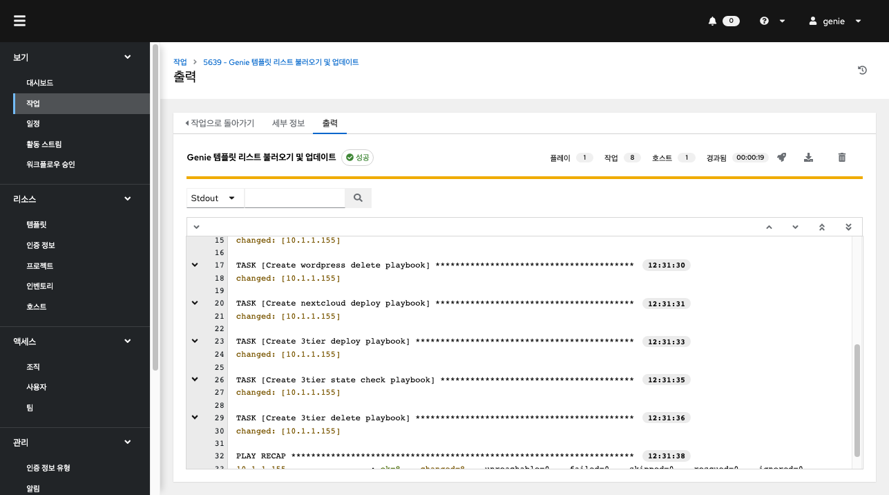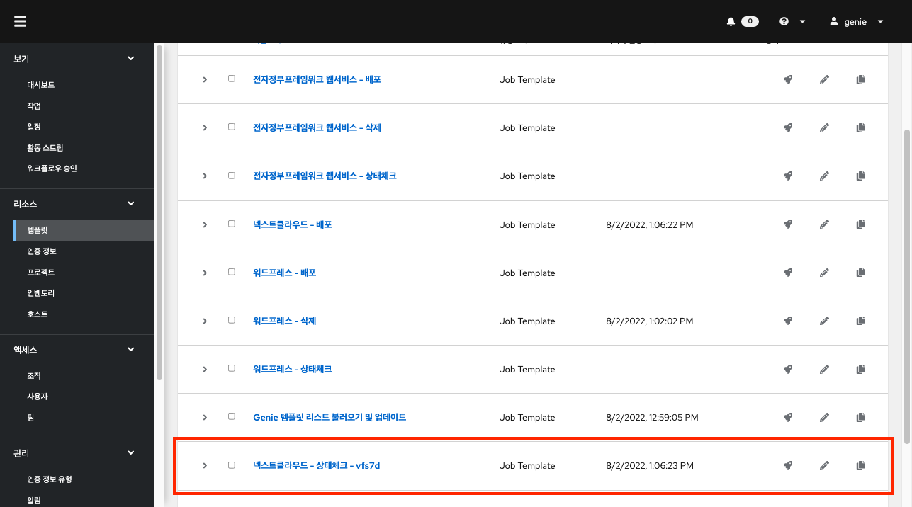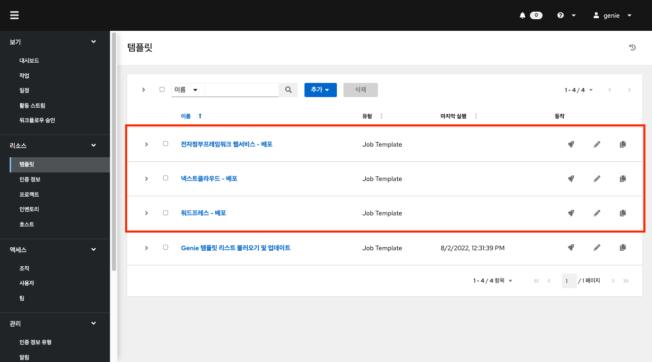정상적으로 작업이 종료된 후 추가된 템플릿을 볼 수 있습니다. 또한 각 리소스 메뉴에서 인증 정보, 프로젝트, 인벤토리, 호스트를 확인할 수 있습니다.