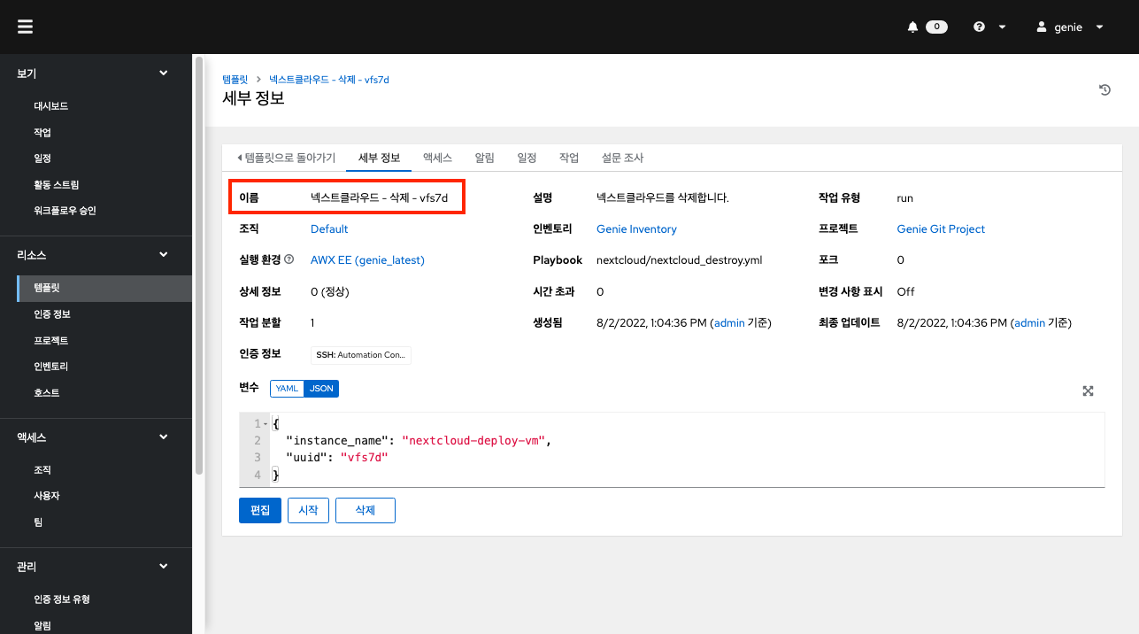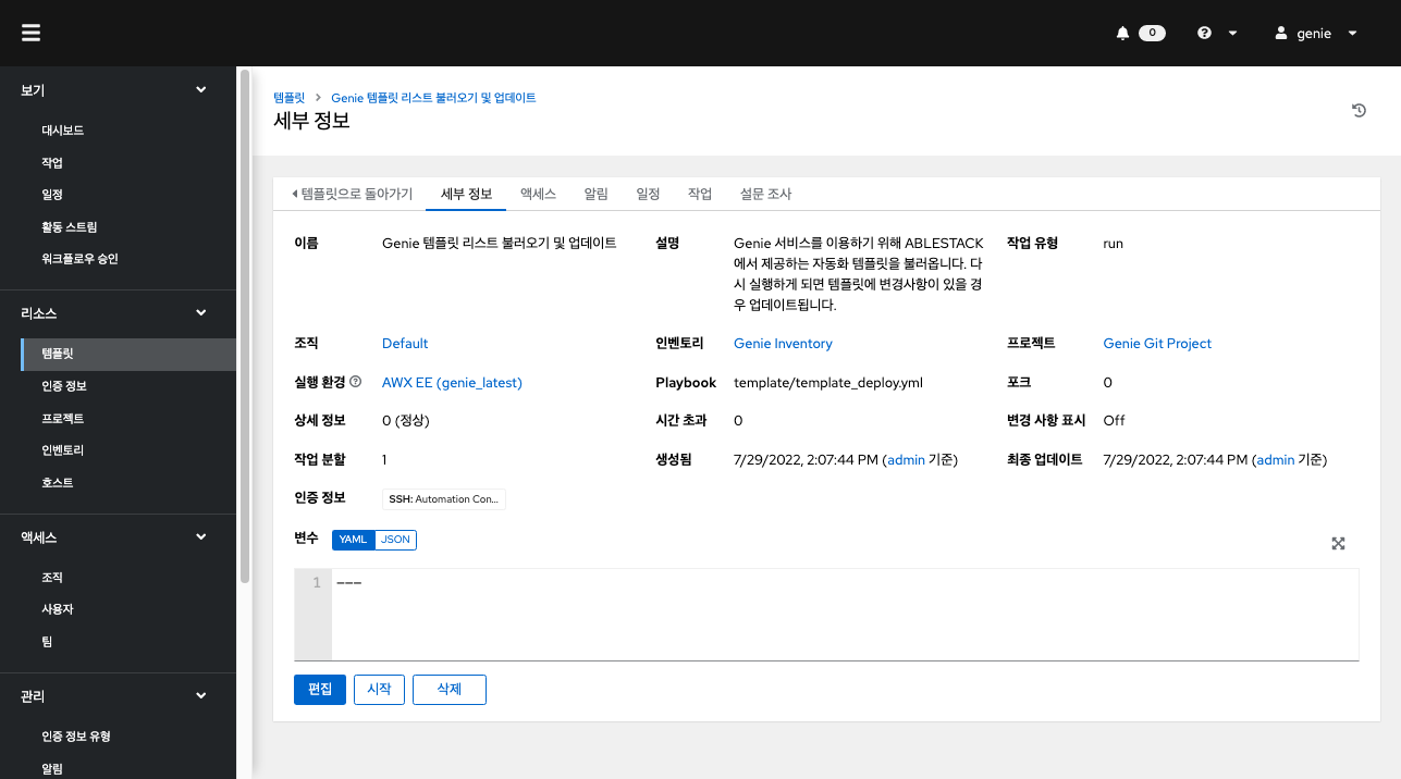 "Genie 템플릿 리스트 불러오기 및 업데이트" 템플릿을 "시작" 버튼을 클릭하여 실행합니다. 이 템플릿은 Genie 서비스를 이용하기 위해 ABLESTACK에서 제공하는 자동화 템플릿을 불러옵니다. 또한, 다시 실행하게 되면 템플릿에 변경사항이 있을 경우 업데이트됩니다.