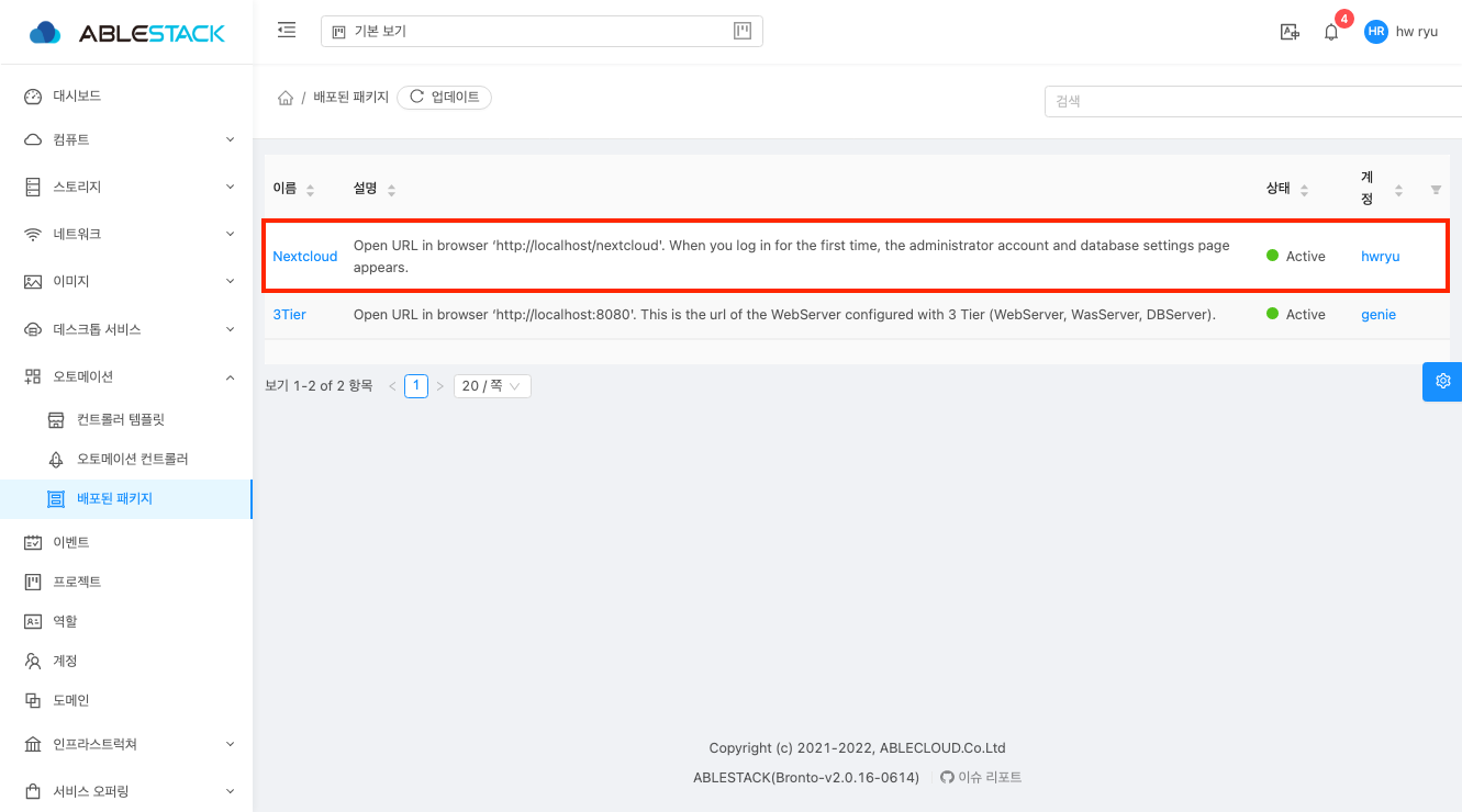 삭제 전 "next cloud" 항목이 존재하지만 삭제 후에는 항목이 삭제된 것을 확인할 수 있습니다.