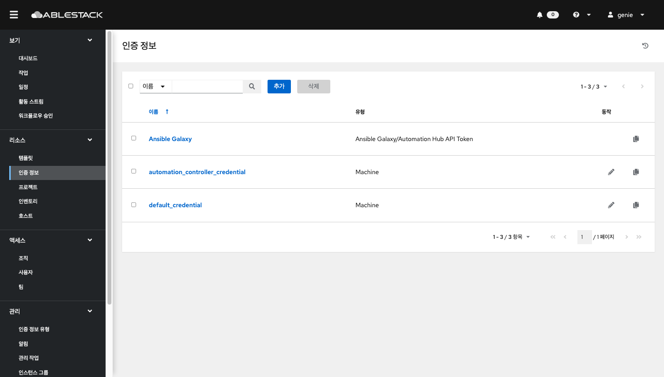 왼쪽 메뉴에서 인증 정보 을 클릭하여 페이지에 액세스합니다. 자격 증명은 인벤토리 목록에 저장된 호스트에 대한 접근 권한을 얻거나 프로젝트 플레이북을 가져올 때 사용됩니다.
