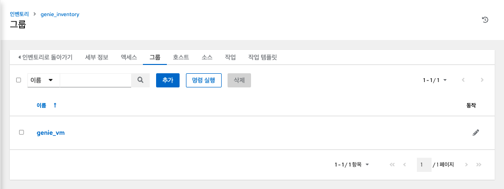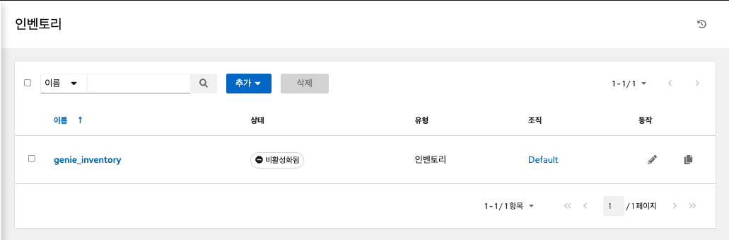 - 이름 : 인벤토리 이름입니다. 인벤토리 이름을 클릭하면 인벤토리의 그룹과 호스트를 보여주는 선택한 인벤토리의 속성 화면으로 이동합니다.
