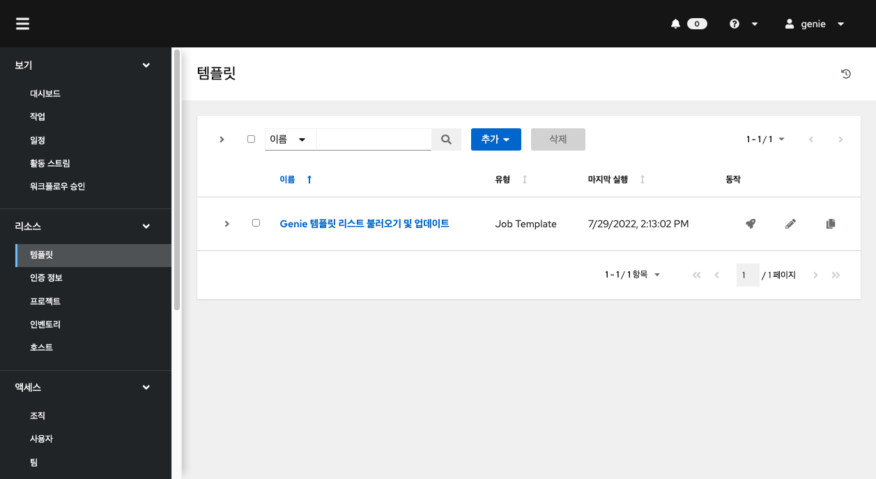 왼쪽 메뉴에서 템플릿 을 클릭하여 페이지에 액세스합니다. 생성된 템플릿 리스트가 표시되며 작업 템플릿을 시작, 편집 및 복사할 수 있습니다.