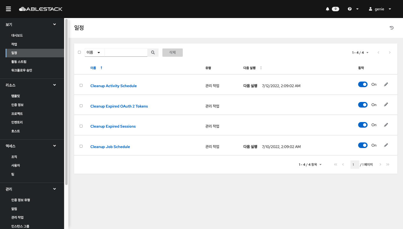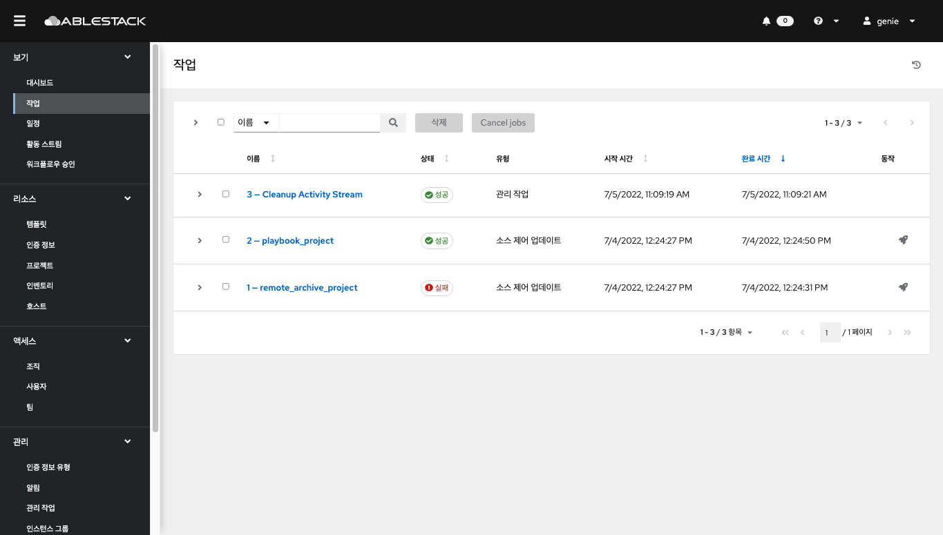 왼쪽 메뉴에서 작업 을 클릭하여 페이지에 액세스합니다. 작업 메뉴는 프로젝트, 템플릿, 관리 작업, SCM 업데이트, 플레이북 실행 등을 포함하여 Genie에서 실행된 모든 작업을 보여줍니다.