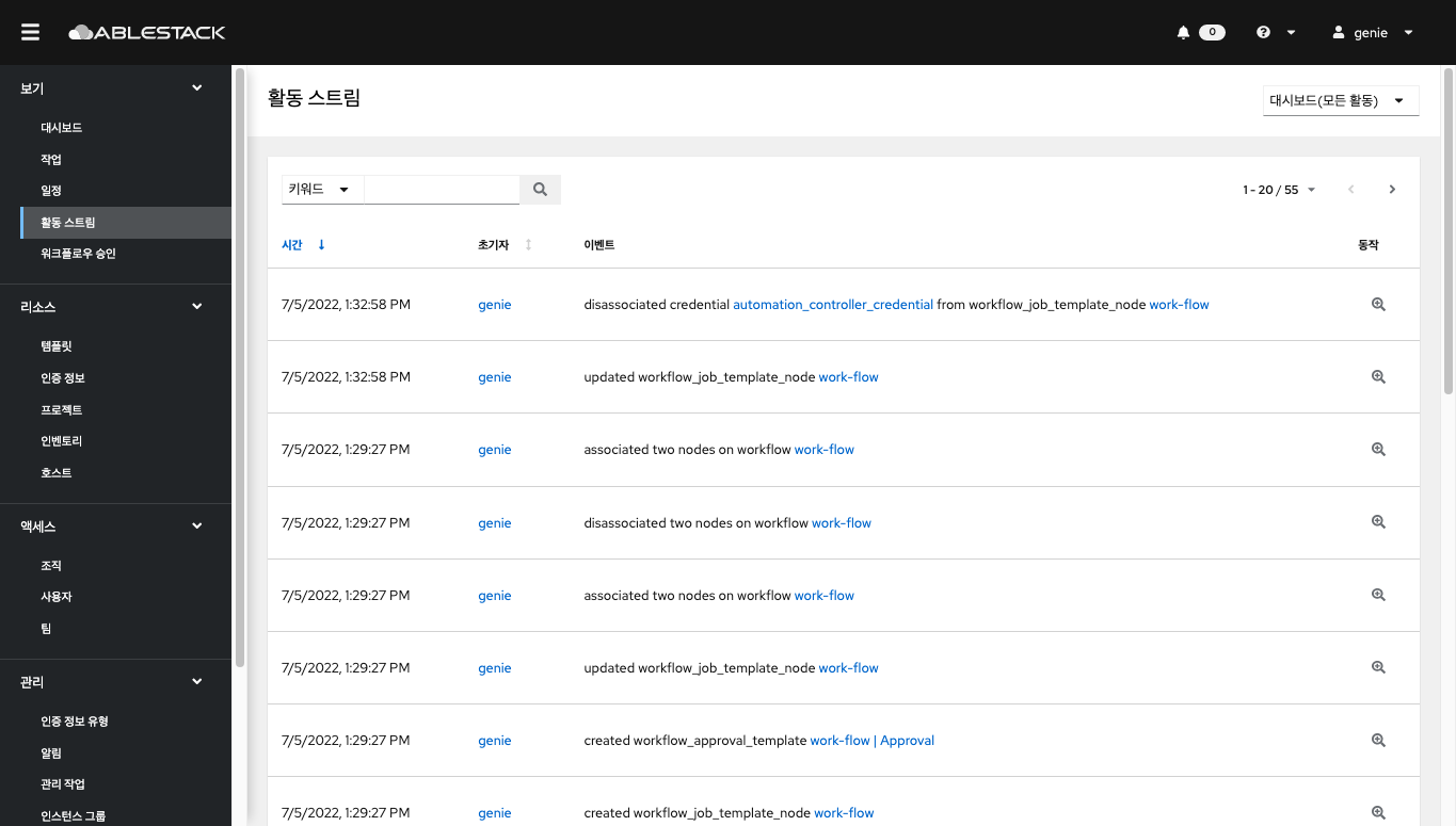 Genie 의 각종 정보를 확인 할 수 있는 대시보드 입니다. 대시보드 상단에는 호스트, 인벤토리 및 프로젝트의 요약을 볼 수 있으며 하단에서는 작업 실행에 대한 시계열 그래프, 최근 작업에 대한 요약, 최근 사용한 템플릿에 대한 정보를 확인할 수 있습니다.