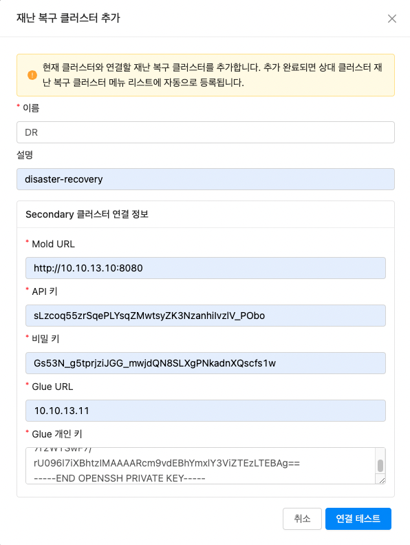 - 연결 테스트 버튼을 클릭하여 Secondary 클러스터의 Mold 와 Glue 상태를 확인하고, 정상인 경우 확인 버튼이 활성화되며 확인 버튼을 클릭하여 재난 복구 클러스터를 추가합니다.