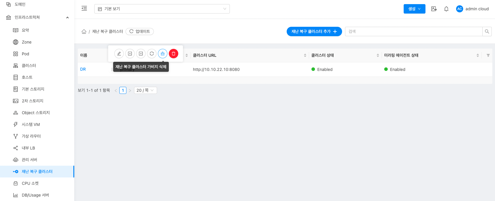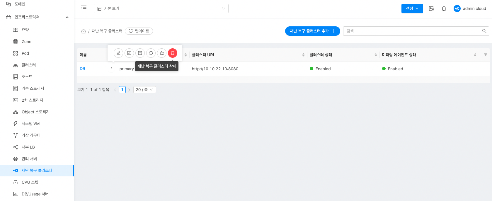 - Primary 클러스터에서 인프라스트럭쳐 > 재난 복구 클러스터 메뉴로 이동하여 더보기 툴팁 액션에 재난복구 클러스터 삭제 버튼을 클릭합니다.