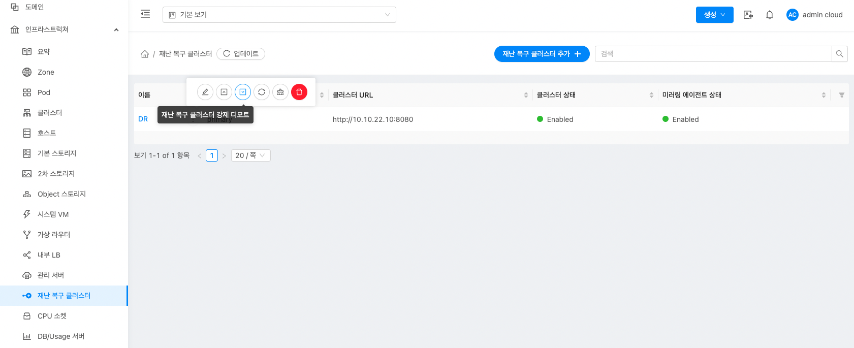 - 인프라스트럭쳐 > 재난 복구 클러스터 메뉴로 이동하여 더보기 툴팁 액션에 재난복구 클러스터 편집 버튼을 클릭합니다.