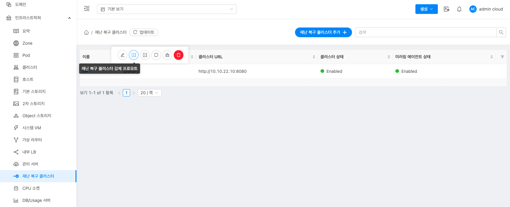 - 더보기 툴팁 액션에 재난 복구 클러스터 강제 프로모트 버튼 클릭