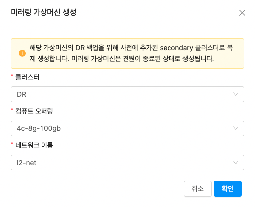 만약, 미러링 가상머신이 있는 경우 해당 이미지에 대한 미러링이 비활성화되며 DR 클러스터를 활성화 하더라도 기존에 생성된 미러링 가상머신이 삭제되어 미러링 가상머신을 다시 생성해야 합니다.