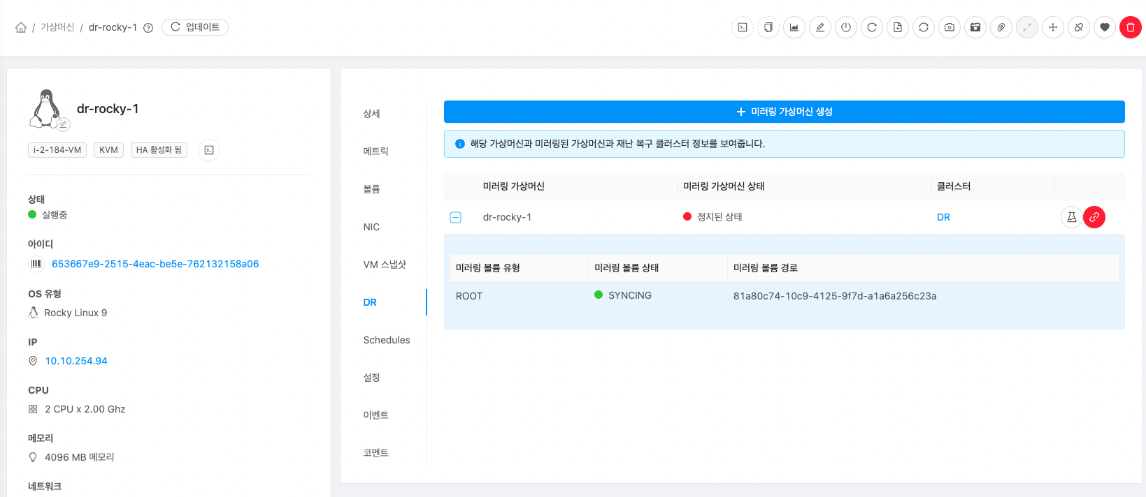 - Primary 클러스터에서 컴퓨트 > 가상머신 메뉴로 이동하여 미러링 할 가상머신의 상세화면의 DR 탭에서 미러링 가상머신 생성 버튼을 클릭합니다.