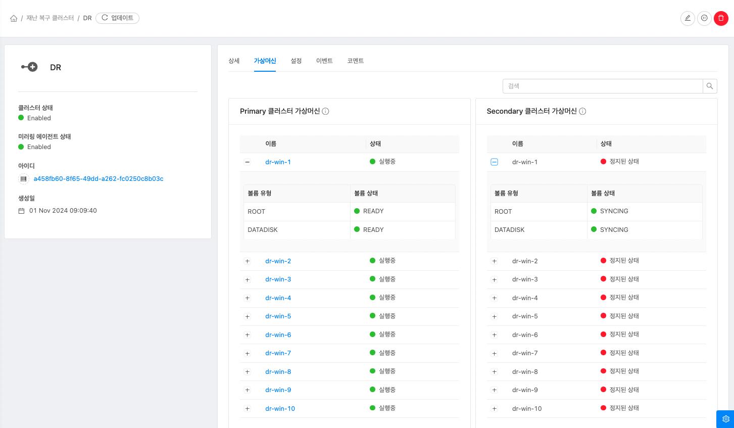 - Primary, Secondary 클러스터에서 인프라스트럭쳐 > 재난 복구 클러스터 메뉴로 이동하여 재난 복구 클러스터 상세화면의 가상머신 탭을 클릭합니다.
