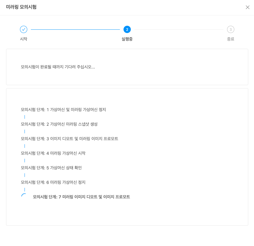 - 미러링 가상머신 모의시험 마법사 화면에서 모의시험 시작 버튼을 클릭하면, 각 모의시험 단계에 따른 절차가 진행됩니다.