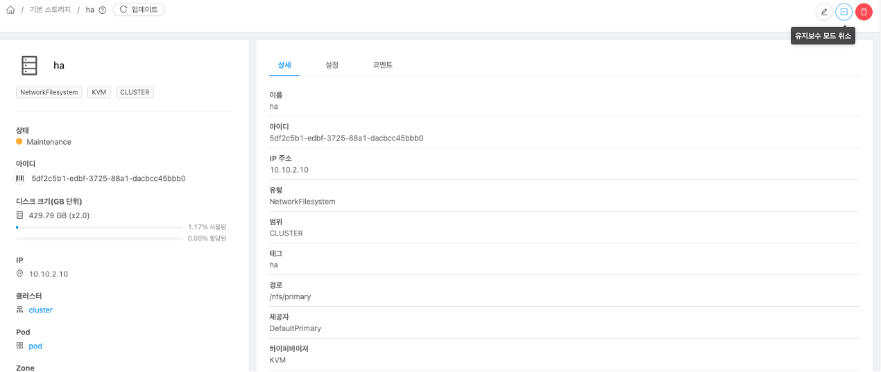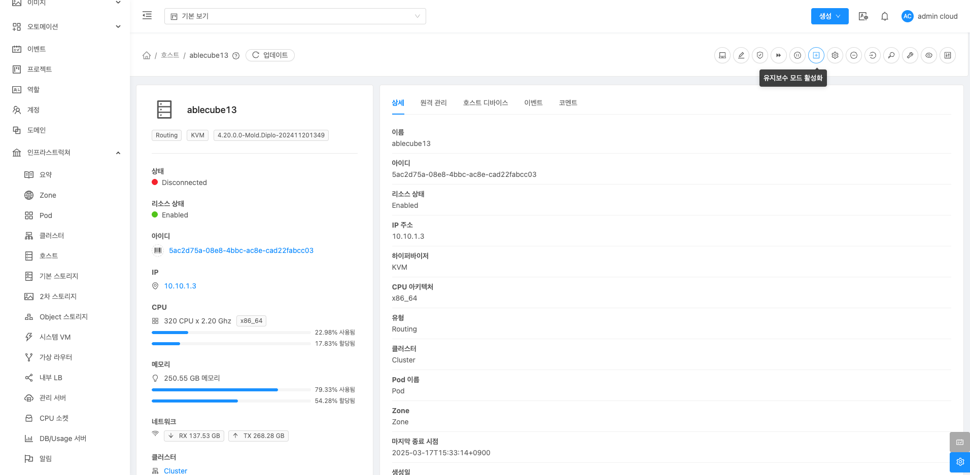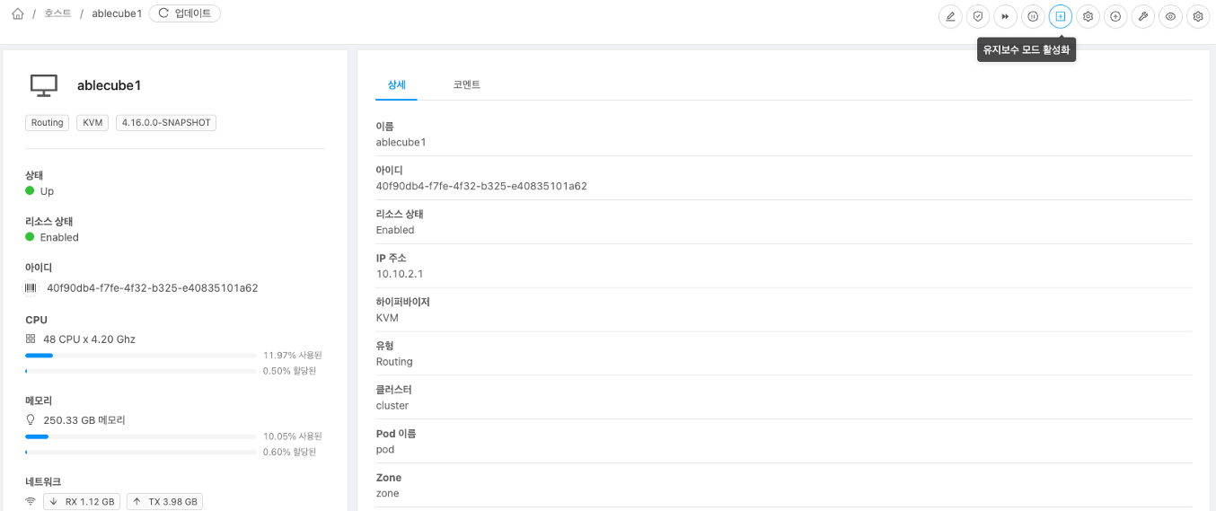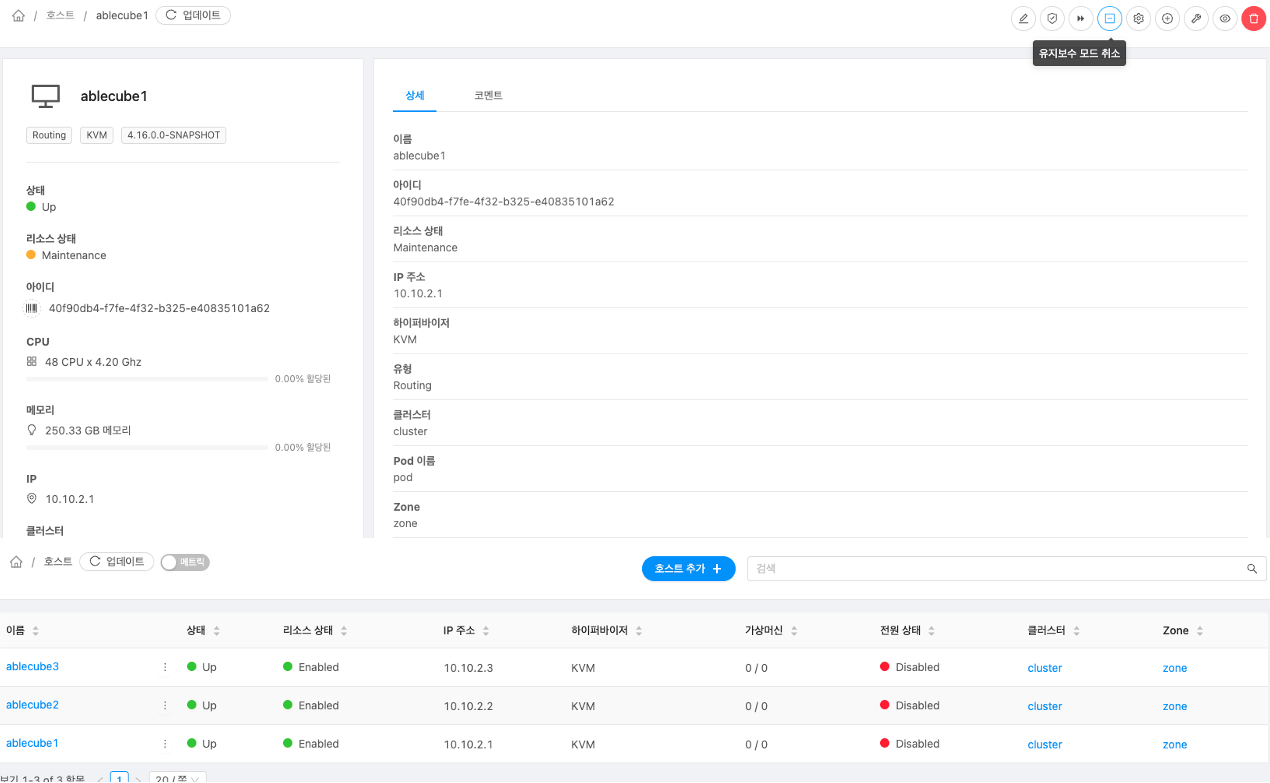 - 유지보수 모드에서 해제 및 호스트 활성화