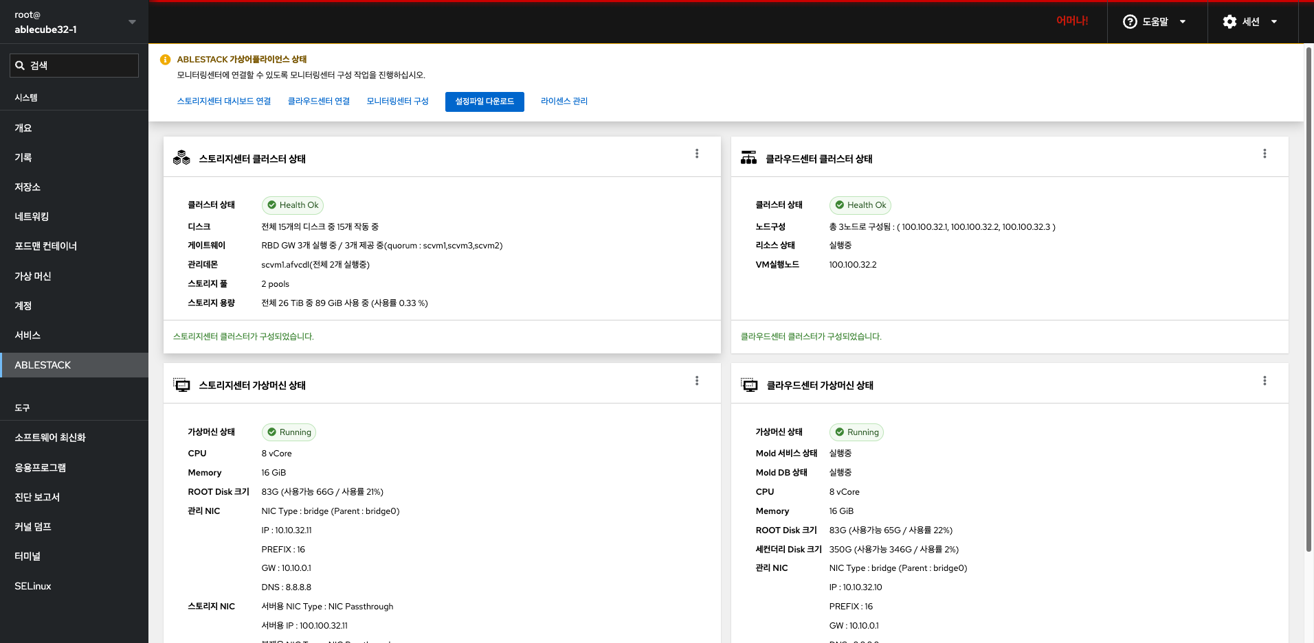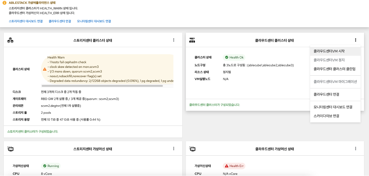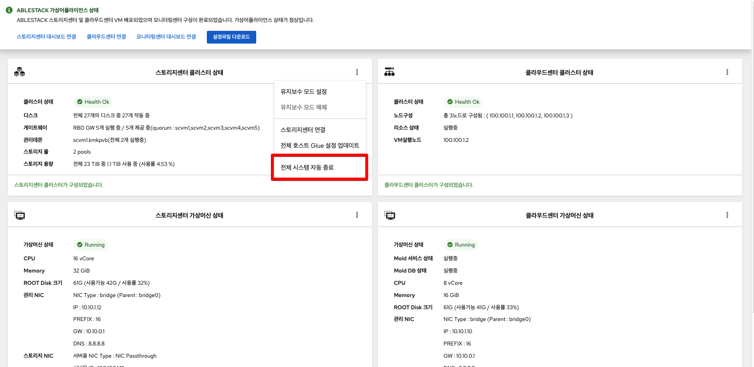 ABLESTACK HCI의 전체시스템을 안정적으로 재기동하기 위해서는 규정된 절차에 따라 시행되어야 합니다. 재기동 절차 및 방법은 다음과 같습니다.