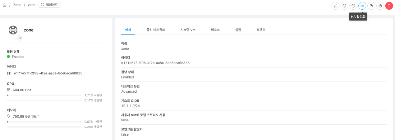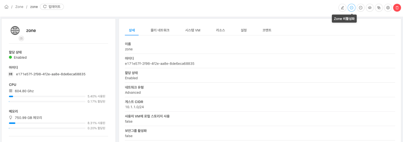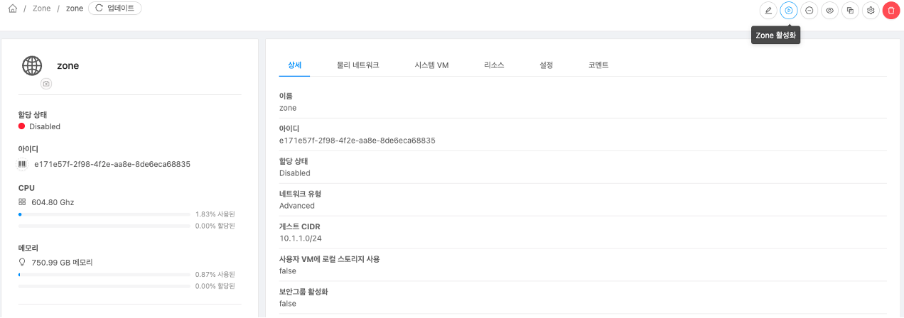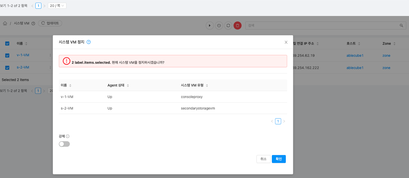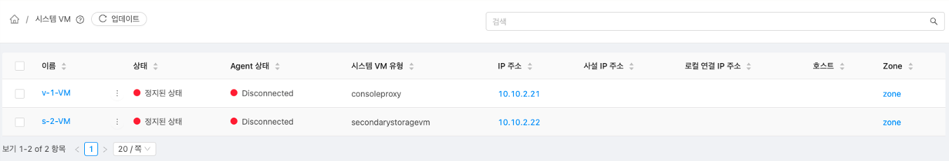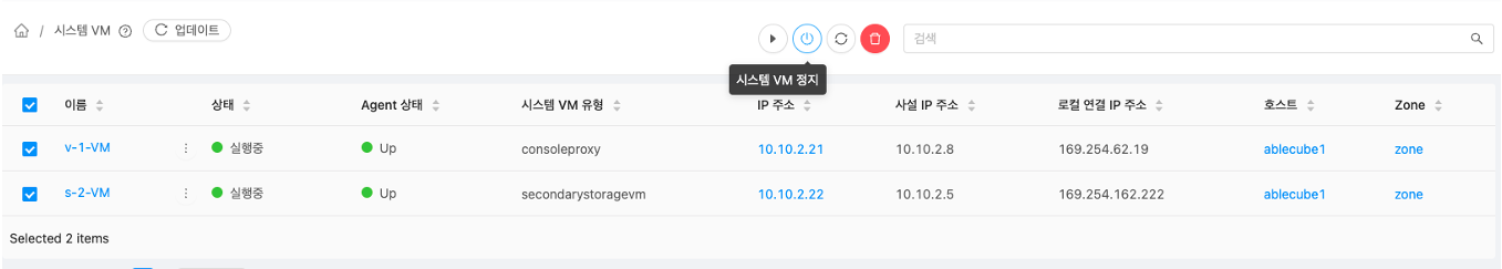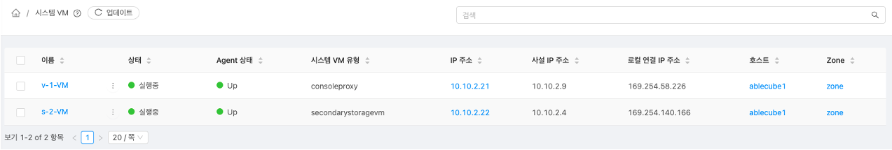 시스템 VM은 별도로 시작하지 않아도 Zone 활성화 후 자동으로 시작됩니다.