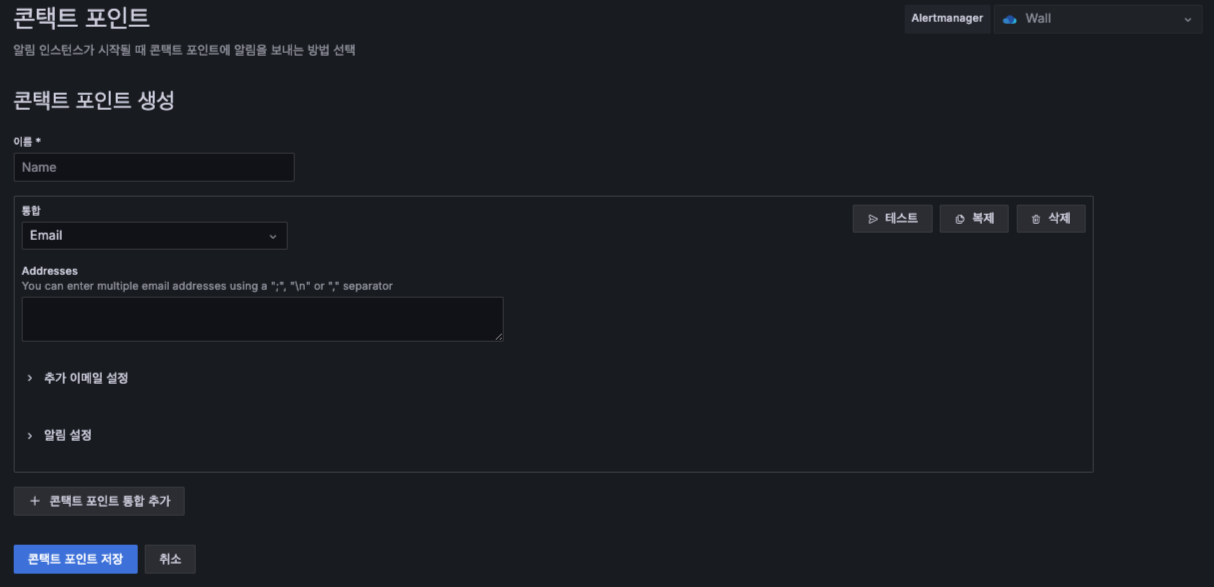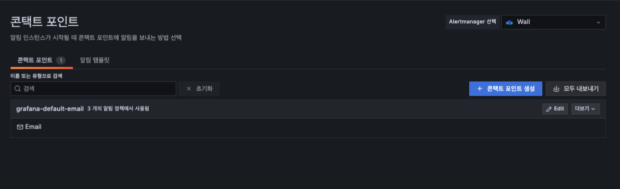 콘택트 포인트 메뉴는 경고 규칙에서 발생한 경고(Alerting 상태)를 특정 대상(Slack, Email, Webhook 등)으로 알리는 역할을 합니다. 즉, Alert Rule이 트리거되었을 때 알림이 전송될 곳을 설정하는 메뉴입니다.