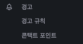 메뉴 구조는 경고 규칙을 확인할 수 있는 "경고 규칙", 경고 알림을 보낼 대상(연락처)을 설정하는 "콘택트 포인트", 경고 알림 서비스를 설정할 수 있는 "알림 채널" 기능으로 구성되어 있습니다.