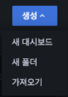생성 메뉴는 사용자가 필요한 대시보드와 폴더를 추가할 때 사용 가능합니다.