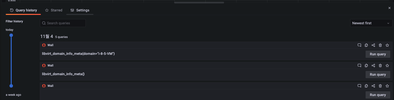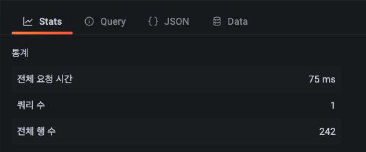 1) 데이터소스를 선택 2) Split : 검색 결과 화면을 분할 3) Clear all : 모든 검색 결과를 초기화 4) Run query : 쿼리 실행 5) Add query : 실행 쿼리를 추가 6) Query history : 쿼리 실행 이력 출력 7) Inspector : 쿼리 결과 (Stats, Query, JSON, Data) 정보 조사