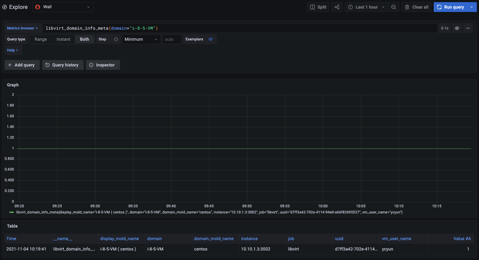 쿼리 실행 결과를 "Graph" 형식과 "Table" 형식 두 가지 방식으로 정보를 제공합니다.