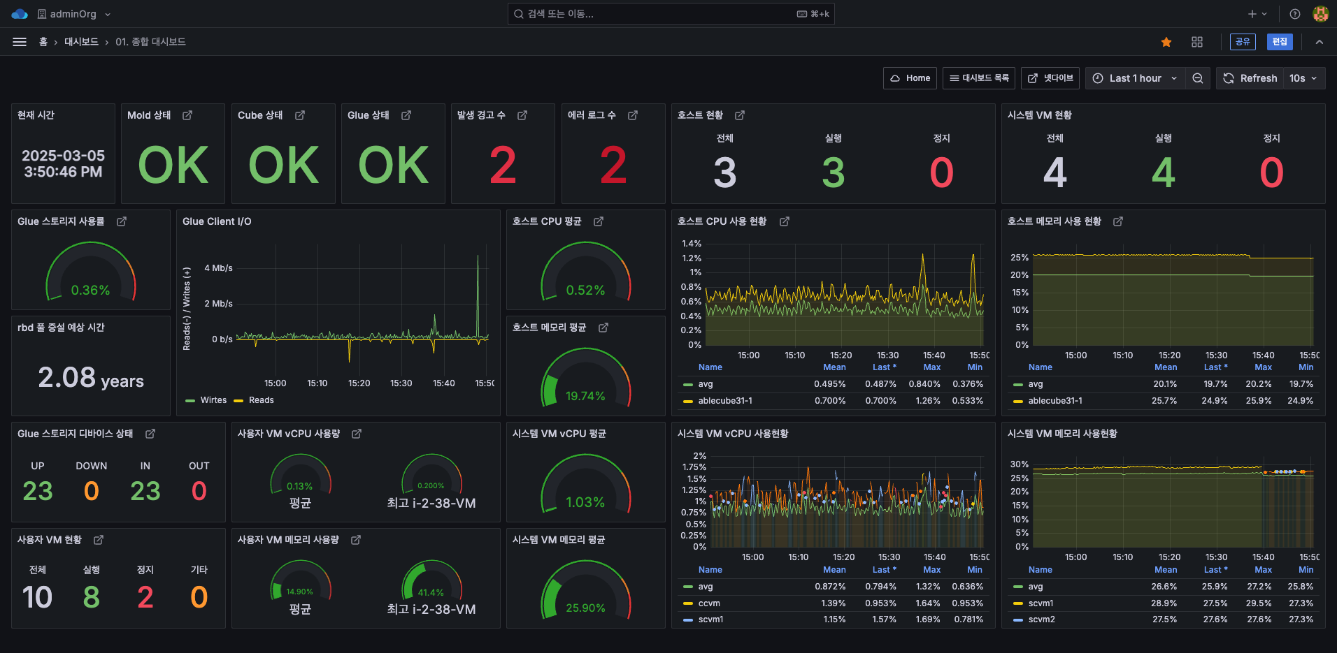 Wall은 관리자와 최종 사용자가 모두 사용할 수 있는 웹 기반 UI를 제공합니다. 관리자는 Wall에 로그인하여 ABLESTACK 모니터링에 필요한 다양한 대시보드를 확인할 수 있으며 장애 이메일 알림서비스를 통해 ABLESTACK 장애상황을 조기에 대처할 수 있습니다. 최종 사용자는 Mold UI를 통해 자신이 소유한 가상머신의 모니터링 정보를 확인할 수 있습니다.