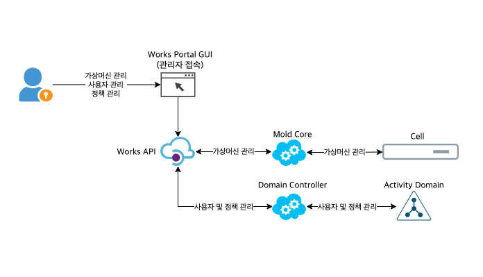 Works 관리자는 워크스페이스, 데스크탑 가상머신, 데스크탑 사용자, 그룹 정책 등을 관리하며 모든 행위는 웹 서비스인 Works 관리자 포털 서비스를 이용하게 됩니다.