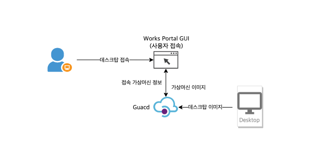 Works는 Mold 에서 구성되는 DaaS 플랫폼이여, Mold 에서 Works 와 관련된 System 가상머신을 배포하여 DaaS를 제공하며, Works 의 관리자 Portal 을 이용하여 사용자용 Desktop 을 제작 및 배포하며, Desktop 사용자는 사용자 Portal을 이용하여, 서비스를 이용 할 수 있습니다.