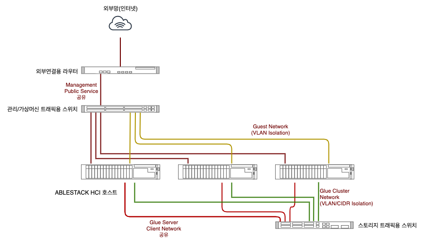 일반적으로 스토리지 트래픽은 Glue 트래픽을 하나의 물리 네트워크로 케이블링하고 게스트용 케이블, 관리용 케이블로 구분하여 케이블링하는 것을 권장합니다. 만약 물리적으로 모든 트래픽을 구분하기 어렵다면 VLAN 등으로 트래픽을 격리하여 트래픽을 처리하도록 구성할 수 있습니다. 이때 스토리지 트래픽은 반드시 물리적으로 분리되도록 설계해야 합니다.