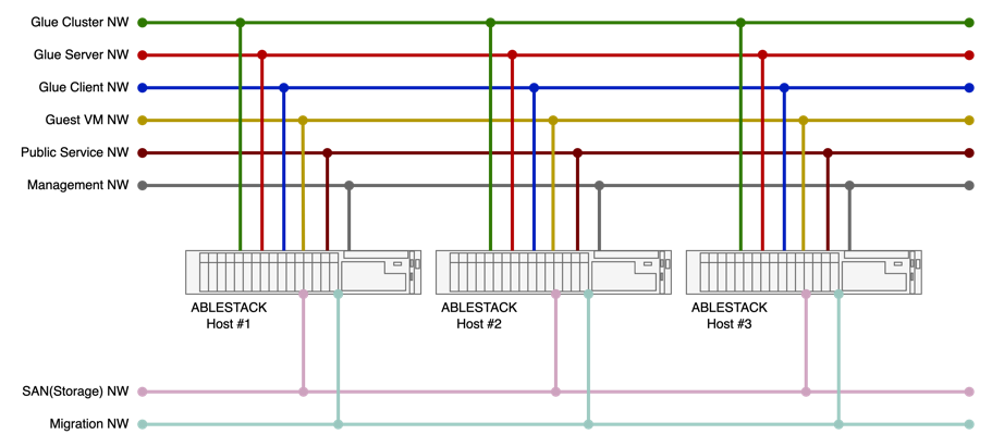 ABLESTACK Glue는 대량으로 발생하는 트래픽을 효과적으로 격리하고 분산하기 위해 3가지의 네트워크를 구성하는 것을 권장합니다. 각각의 네트워크의 역할과 포트 구성은 다음과 같습니다.