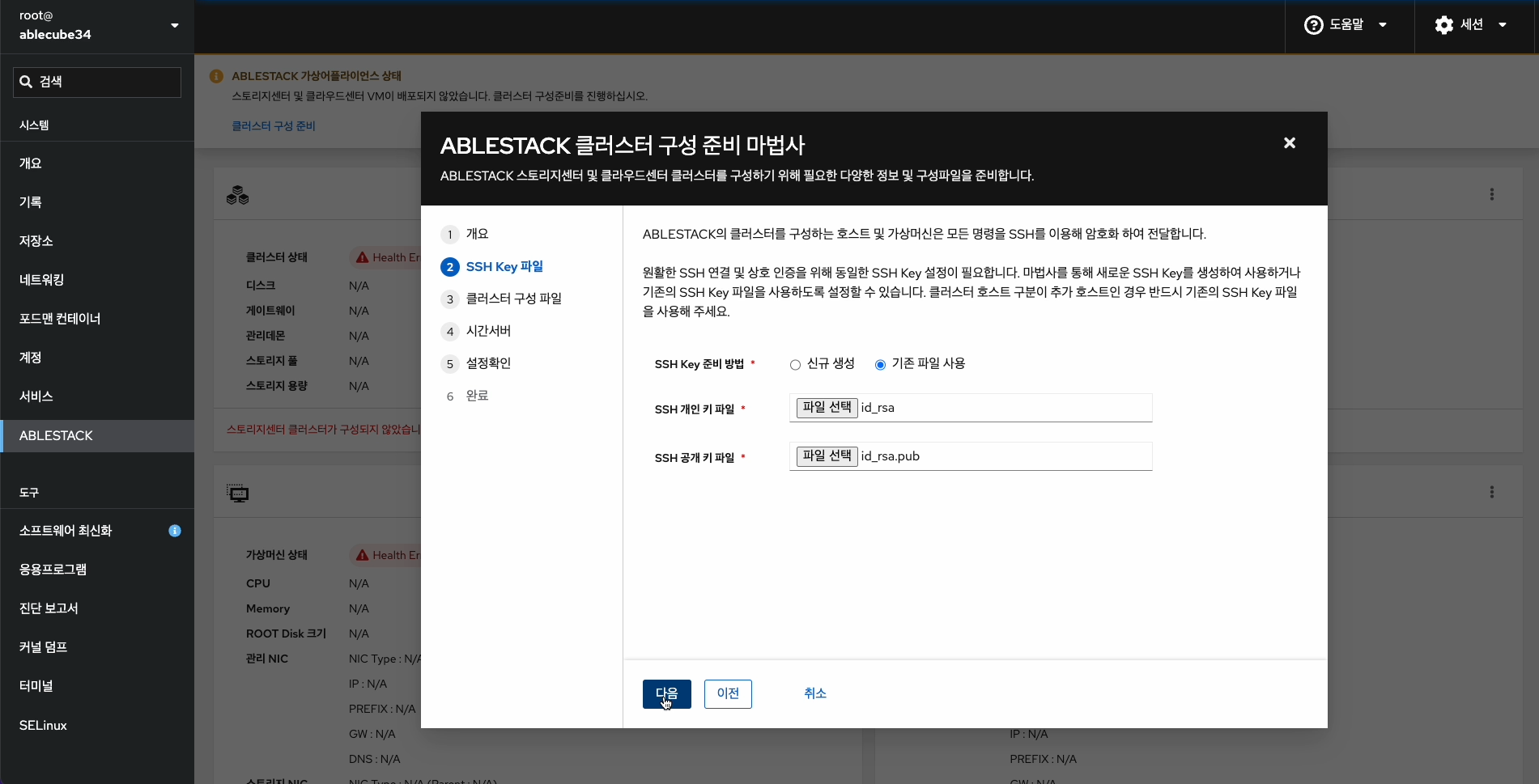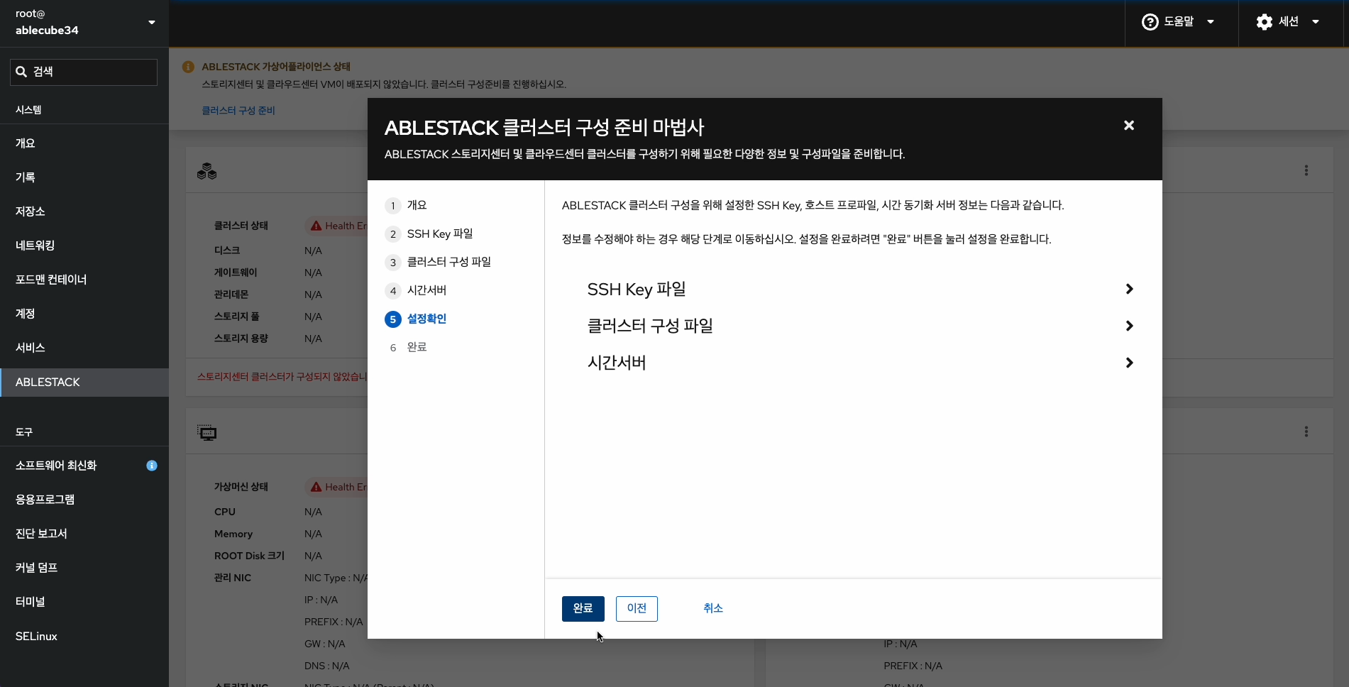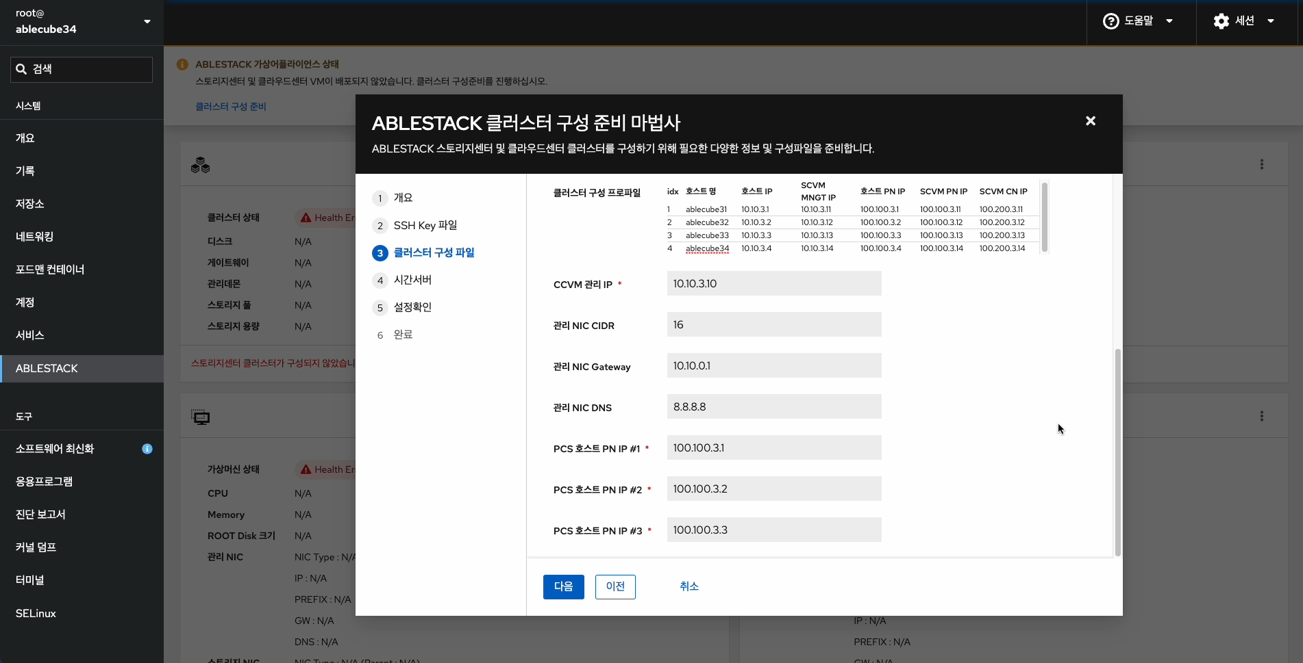 - ABLESTACK 구성을 하는데 필요한 정보를 입력 받아 클러스터 구성을 준비하는 마법사 화면입니다.