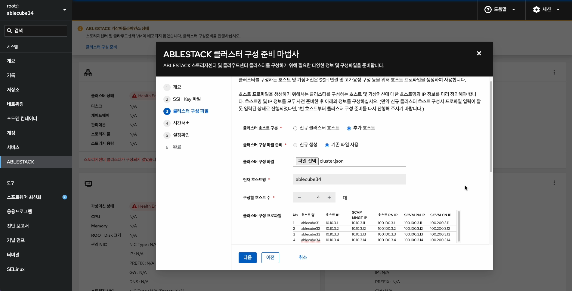 - 클러스터 구성 파일 준비 해당 호스트 파일 사용으로 자동 선택되며, ablecube 호스트 설정 정보를 자동으로 읽어와 클러스터 구성 정보 및 네트워크 IP 정보를 세팅합니다.