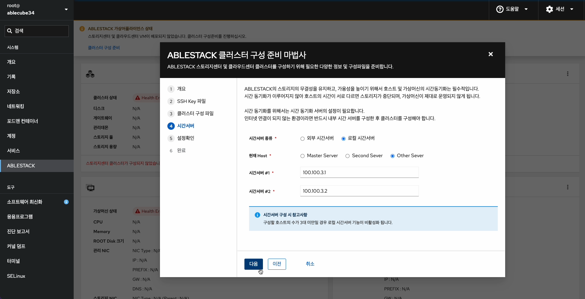 - 외부 시간 서버 및 시간서버 1 에는 1번 호스트의 Public Storage IP, 시간서버 2 에는 2번 호스트의 Public Storage IP 을 확인하고 다음 버튼을 클릭합니다.